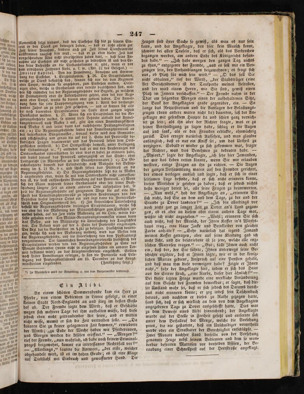 Zeugen ſind ihrer Sache ſo gewiß, als man es nur ſein kann, und der Angeklagte, den hier kein Menſch kennt, ſchwört bei allen Teufeln, daß er ſich, als das Verbrechen begangen worden, am andern Ende des Königreichs befun— den habe.“—„Ich habe morgen den ganzen Tag nichts zu thun,“ entgegente der Fremde,„und es ſoll mir ein Ver⸗ gnügen ſein, den Verhandlungen beizuwohnen; es fragt ſich nur, ob Platz für mich ſein wird.“—„O das ſoll Sie nicht abhalten,“ rief der Wirth,„der Stabsträger(eine Art Gerichtsdiener) iſt der Taufpathe meines Aelteſten, und der wird einem Herrn, wie Sie ſind, gewiß einen Platz im Innern verſchaffen.“— Der Fremde nahm in der That am folgenden Morgen einen der aufbehaltenen Sitze, der Bank der Angeklagten grade gegenüber, ein.— So lange das Requiſitorium und die Ausſagen der Belaſtungs⸗ zeugen(denn andere waren nicht da) dauerten, ſaß der An⸗ geklagte mit geſenktem Haupte da und ſchien ganz vernich— tet zu ſein; als ihn aber der Richter fragte, was er zu ſeiner Vertheidigung zu ſagen habe, ſchlug er die Augen auf und ſank, als er den Fremden erblickte, ohnmächtig zurück. Dies erregte natürlich Aufſehen, und man glaubte anfänglich, daß es nur ein Kniff ſei, um das Urtheil zu verzögern. Sobald er wieder zu ſich gekommen war, fragte der Richter, was dies Benehmen zu bedeuten habe.— „Mylord,“ ſagte der Angeklagte,„ich ſehe hier Jemanden, der mir das Leben retten könnte, wenn Sie mir erlauben wollten, einige Fragen an ihn zu richten.— Die Augen der ganzen Verſammlung waren auf den Fremden gerichtet, der etwas verlegen ausſah und ſagte, daß er ſich in einer ſeltſamen Lage befinde, daß er ſich nicht erinnern könne, dieſen Menſchen je geſehen zu haben, daß er jedoch nichts deſto weniger bereit ſei, alle ſeine Fragen zu beantworten. —„Nun wohl,“ hob der Angeklagte an,„erinnern Sie ſich nicht, daß Sie an dem und dem Tage, zu der und der Stunde zu Dover landeten?“—„Ich bin allerdings vor noch nicht gar zu langer Zeit zu Dover an's Land gegan⸗ gen, ob es aber an dieſem oder einem andern Tage war, wüßte ich nicht anzugeben.“—„Wohl; erinnern Sie ſich auch nicht, daß der Menſch, der Ihren Koffer in's Wirths— haus trug, eine blaue Jacke und Beinkleider von gleicher Farbe anhatte?—„Sehr natürlich hat irgend Jemand meinen Koffer getragen, aber auf ſeine Kleidung gab ich nicht Acht, und die beſchriebene iſt ja jene, welche alle eng liſchen Matroſen tragen.“—„Gut; fällt Ihnen auch nicht ein, daß der, der Sie führte, Ihnen unterwegs ſeine Ge— ſchichte erzählte, daß er Ihnen ſagte, wie er in der koͤnig— lichen Marine gedient, Anſpruch auf eine Penſion gehabt, und daß man ihm dieſe verweigert habe? Zeigte er Ihnen nicht,“ fuhr der Angeklagte fort, indem er ſich das Haar aus der Stirne ſtrich,„eine Narbe, dieſer hier ähnlich?“— Bei dieſer letzten Frage wurde eine merkliche Veränderung auf dem Geſicht des Fremden bemerkbar; er ſagte, daß die⸗ ſer Umſtand wahr ſei, daß er ſich jedoch des Datums durch⸗ aus nicht erinnern könne; er zog indeß ſein Taſchenbuch heraus, und nachdem er dieſes zu Rathe gezogen hatte, fand ſich, daß er ſich wirklich an dem von dem Angeklagten angegebenen Tage zu Dover ausgeſchifft hatte. Dies war zu dem Beweiſe eines Alibi hinreichend; der Angeklagte wurde auf der Stelle in Freiheit geſetzt und entfernte ſich unter dem Beifallruf der Menge, welche die Vorſehung pries, die nie geſtattete, daß ein Unſchuldiger verurtheilt werde oder ein Strafbarer der Gerechtigkeit entſchlüpfe.— Zwei Monate nachher ſtand derſelbe von der Vorſehung genannte Zeuge nebſt ſeinem Bedienten und dem ſo wun⸗ derbar befreiten Matroſen vor denſelben Aſſiſen, der Be— raubung einer Schnellpoſt auf der Heerſtraße angeklagt.