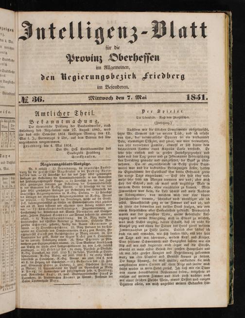 Gottes dienſ 9 0 0* 1 2 2 86. Mittwoch den 7. Mai 1851. e i ſe.. a E Amtlicher Theil. Y ere d lech —— 5 5 Ein Lebensbild. Nach dem Franzöſiſchen. B. Nr. n Bekannt ma ch un g,(Fortsetzung.) Nan bun Die theoretiſche Prüfung der Bauhandwerker, nach e bing— A 1— —— Anleitung des Regulativs vom 27. Auguſt 1845, wird Nachdem wir die üblichen Complimente ausgetauſcht, 53 5 für das erſte Semeſter 1851 künftigen Montag den 12. ſetzte Mr. Clement ſich an unſern Tiſch, und 00 erfuhr „ 6%. Mai l. J., Vormittags 9 Uhr, auf dem Büreau des Un⸗ von ihm, der vermeintliche Spanier ſei ein verbannter 10 5— terzeichneten vorgenommen.“ Pole, ehemaliger Offizier, und zwar, wie man vermuthete, 46313. Friedberg den 4. Mai 1851. f N von ſehr vornehmer Familie, obwohl er ſich hinter dem Der Gr. Heſſ. Kreisbaumeiſter des beſcheideuen Namen eines Kapitän Carlo verſtecke. Er rare Baubezirks Friedberg lebe ſehr einfach und in großer Zurückgezogenheit und E Stockhauſen. habe erſt den Tag zuvor und zu Jedermanns Ueberraſchung ind Vutzbat N 7 den Vorſchlag gemacht und ausgeführt, die Bank zu über⸗ . Regierungsblatt⸗Auszüge N nehmen. Da er augenſcheinlich im Beſitz Neeber Baar⸗ . Mai 0 de ei Ae de en 155 mittel war und die lockendſten Bedingungen ſtellte, hatten ung für die ger! 12 agiſtratur in** 8 an 5 N 5 1 deen ber.— 2) ueberſicht der für dae Jahr 1851 genehmigten die 5 der Spielbank ihm deren Gebrauch gerne Fed, Biß, Umlagen zur Beſtreitung der Communalbedürfniſſe in den Gemeinden für einige Tage eingeräumt.— Erſt ſehr ſpät oder viel⸗