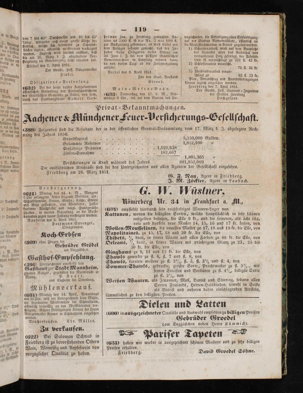 5,250,000 Gulden. 2,852,100„ 1,622,638 182,667 1,805,305 5 Verſicherungen in Kraft während des Jahres 881,952,069„ Die ausführlichen Abſchlüſſe ſind bei den Unterzeichneten und allen Agenten der Geſellſchaft einzuſehen. Friedberg am 28. März 1851.
