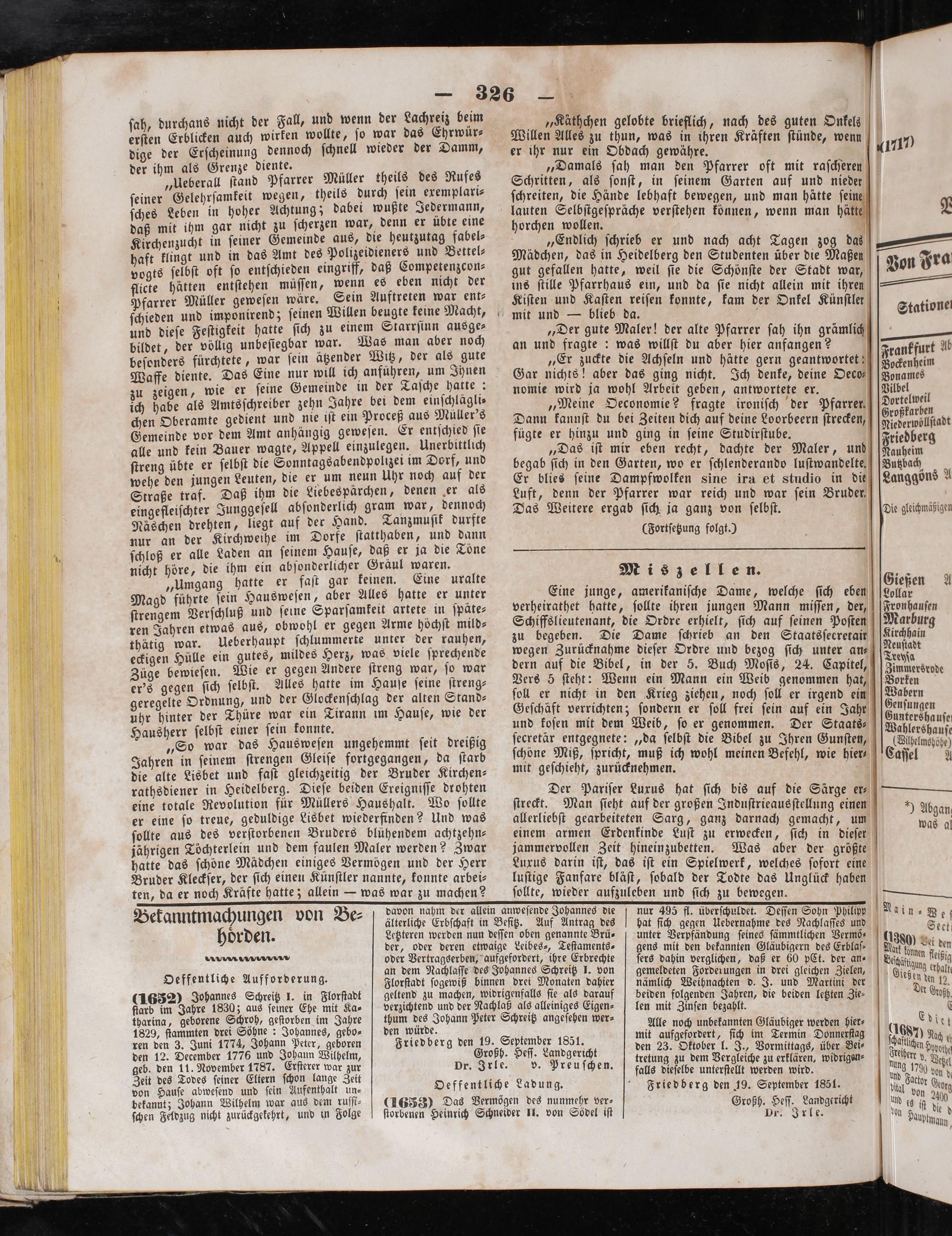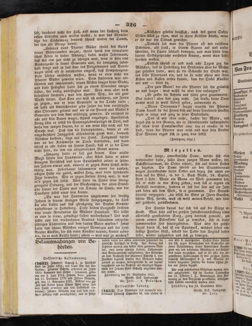 davon nahm der allein anweſende Johannes die älterliche Erbſchaft in Beſitz. Auf Antrag des Letzteren werden nun deſſen oben genannte Brü⸗ der, oder deren etwaige Leibes-, Teſtaments⸗ oder Vertragserben, aufgefordert, ihre Erbrechte an dem Nachlaſſe des Johannes Schreitz I. von Florſtadt ſogewiß binnen drei Monaten dahier geltend zu machen, widrigenfalls ſie als darauf verzichtend und der Nachlaß als alleiniges Eigen⸗ thum des Johann Peter Schreitz angeſehen wer⸗ den würde. Friedberg den 19. September 1851. Großh. Heſſ. Landgericht Dr. Irle. v. Preuſchen.