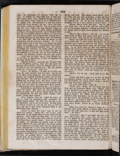 haben. Zur Beruhigung des geneigten Leſers ſetze ich hinzu: der October von Anno 1847 hatte ja auch unge⸗ mein warme, ſchöne Tage, faſt Frühlingstage; auch wird das Herz wieder warm, wenn es auf die blühenden Auen der Jugend blickt. Und überhaupt, iſt denn den reiferen, Jahren alle Poeſie geraubt? Ich ſage: Nein! Den Rah⸗ men meines Bildes zu vollenden, bitte ich meinen lieben Leſer und holde Leſerin, ſich noch folgendes lebhaft zu vergegenwärtigen. Es iſt ein netter, leichter, zurückgeleg⸗ ter Wagen, der langſam dahinrollt. In des Wagens rechter Ecke ſitzt ein behaglich ausſehender Mann von etwa neun und vierzig Jahren, von wohlgenährtem Aeußern und er⸗ klecklichem Umfange, der ſeine Pfeife raucht und freundlich in die Welt ſieht. Auf dem Bocke ſitzt Kaspar in dem Hechtgrauen und der gedachten Filzmütze. Er hat ſich bequem geſetzt, daß er dem Mann im Wagen und ſeinen Roſſen, deren Zügel er hält, gewiſſenhaft ſeine Aufmerk⸗ ſamkeit, je nach Bedürfniß zuwenden kann. Der Himmel iſt tiefblau und wolkenlos; die Sonne ſendet noch bele⸗ bende Strahlen herab; die Luft iſt mild; das Feld und die Landſtraße leer und ſtill, und wir Beide plaudern ge—⸗ müthlich von Kaspar's Heimath und was dazu gehört.