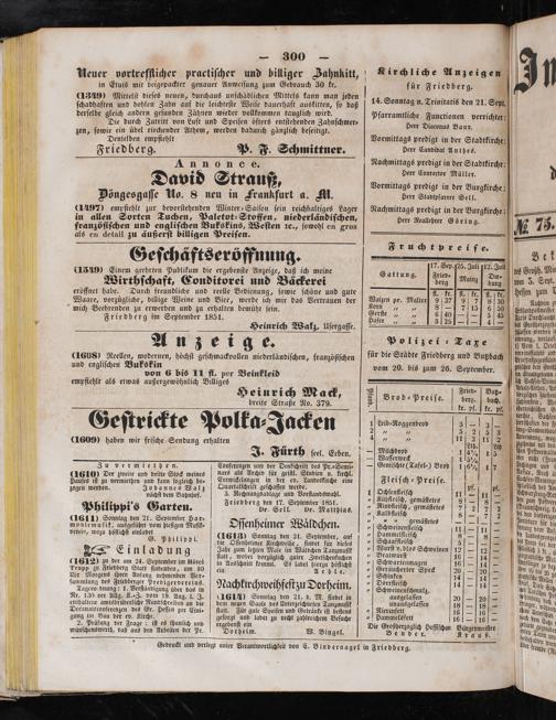 vom 20. bis zum 26. September. 2 5 Fried⸗ Butz⸗ Brod⸗Preiſe. berg.] bach. S 5 kr. pf. kr. pf. 1. Leib⸗Roggenbrod 3 2 33 2„, 7 5215 3 A 75 11 9 5 11125 — Milchbrod 1 4%, 1 59 — Waſſerweck 115¼%/ — Gemiſchte(Tafel⸗) Brod 1 6+. 17 Fleiſch-Preiſe. a 5 5 1 Ochſenfleiſch 11 5 11 2 „ Kühfleiſch, gemäſtetes 8— 8— „ Rindfleiſch, gemäſtetes ie „ Kalbfleiſch 8— 7 2 1 1 gemäſtetes—=— „ Schweinenfleiſch 11— 111— „Hammellleiſch 8— 181— 7 Schaaffleiſch 5——— „ Wurſt v.blos Schweinen 12— 124— „ Bratwurſt 16— 14— „Schwartenmagen 16— 14— „Geräucherter Speck 20—20.— „Schinken 14— 14— „ Dörrfleiſch 14— 14— „Schweinenſchmalz,— ausgelaſſen 20— 20— unausgelaſſen 18— 118— „Nierenfett 16— 16— „ Hammelsfett 161— 16— Die Großherzoglich Heſſiſchen Bürgermeiſter Bender. Krauß.