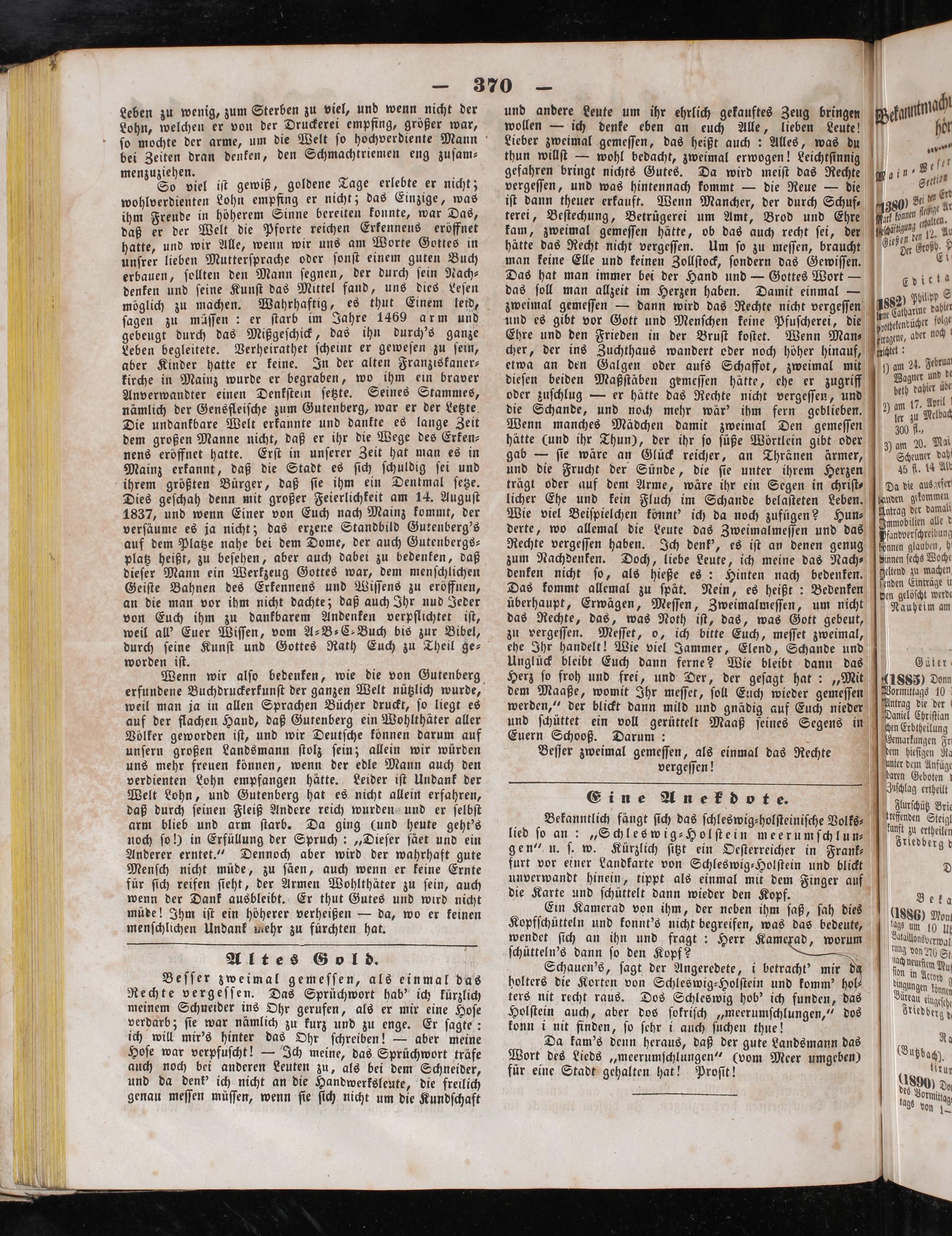 bei Zeiten dran denken, den Schmachtriemen eng zuſam— iehen. f eee viel iſt gewiß, goldene Tage erlebte er nicht; wohlverdienten Lohn empfing er nicht; das Einzige, was ihm Freude in höherem Sinne bereiten konnte, war Das, daß er der Welt die Pforte reichen Erkennens eröffnet hatte, und wir Alle, wenn wir uns am Worte Gottes in unſrer lieben Mutterſprache oder ſonſt einem guten Buch erbauen, ſollten den Mann ſegnen, der durch ſein Nach⸗ denken und ſeine Kunſt das Mittel fand, uns dies Leſen möglich zu machen. Wahrhaftig, es thut Einem leid, ſagen zu mäſſen: er ſtarb im Jahre 1469 arm und gebeugt durch das Mißgeſchick, das ihn durch's ganze Leben begleitete. Verheirathet ſcheint er geweſen zu ſein, aber Kinder hatte er keine. In der alten Franziskaner⸗ kirche in Mainz wurde er begraben, wo ihm ein braver Anverwandter einen Denkſtein ſetzte. Seines Stammes, nämlich der Gensfleiſche zum Gutenberg, war er der Letzte Die undankbare Welt erkannte und dankte es lange Zeit dem großen Manne nicht, daß er ihr die Wege des Erken⸗ nens eröffnet hatte. Erſt in unſerer Zeit hat man es in Mainz erkannt, daß die Stadt es ſich ſchuldig ſei und ihrem größten Bürger, daß ſie ihm ein Dentmal ſetze. Dies geſchah denn mit großer Feierlichkeit am 14. Auguſt 1837, und wenn Einer von Euch nach Mainz kommt, der verſäume es ja nicht; das erzene Standbild Gutenberg's auf dem Platze nahe bei dem Dome, der auch Gutenbergs— platz heißt, zu beſehen, aber auch dabei zu bedenken, daß dieſer Mann ein Werkzeug Gottes war, dem menſchlichen Geiſte Bahnen des Erkennens und Wiſſens zu eröffnen, an die man vor ihm nicht dachte; daß auch Ihr nud Jeder von Euch ihm zu dankbarem Andenken verpflichtet iſt, weil all' Euer Wiſſen, vom A-B-⸗C- Buch bis zur Bibel, durch ſeine Kunſt und Gottes Rath Euch zu Theil ge⸗ worden iſt. g