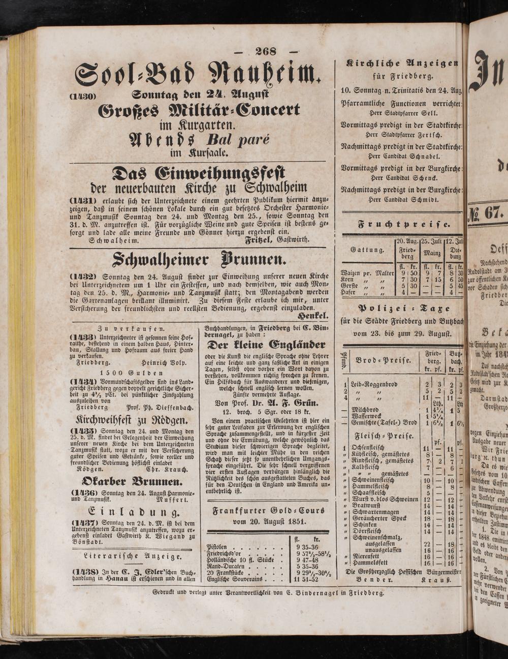tag den 25. d. M., Harmonie- und Tanzmuſik ſtatt; den Montagabend werden[ Hafer„ 4 2 Friedber die Gartenanlagen brillant illuminirt. Zu dieſem Feſte erlaube ich mir, unter Die Verſicherung der freundlichſten und reellſten Bedienung, ergebenſt dee f Polizei Ta x e 8 entel. 5„ 2 2— 5 für die Städte Friedberg und Butzbach Zu verkaufen. Buchhandlungen, in Friedberg bei C. Bin⸗ 23. bis 29. A U. 5 F 0 G85 mae icnen iſt geſonnen 5 Hof⸗ dernagel, zu haben:& 1 n vom 23. bis zum 29. uguſt. 4 raithe, beſtehend in einem halben Haus, Hinter⸗ 1 2 4 ö ini bau, Stallung und Hofraum aus freier Hand Der kleine ng ander Fried⸗ B 7. ſehung der zu verkaufen. oder die Kunſt die engliſche Sprache ohne Lehrer D 5 ried⸗ Buß. in Jr 184. Friedberg. Heinrich Volp. auf eine leichte und ganz faßliche Art in einigen Brod⸗Preiſe. berg. bach. dat 15 0 0 Gn d e Tagen, Bun 11 1 Wort dapon zu 8 kr. pf. kr. pf. f 1 8555 verſtehen, vollkommen richtig ſprechen zu lernen. f 1 en Re (148) Vormundſchaftsgelder find ins Land. Ein Hilfsbuch für Auswanderer und diefenigen, 1. Leib⸗Roggenbrod 2 3 2 3 Etz wird zur K gericht Friedberg gegen doppelt gerichtliche Sicher⸗ welche ſchnell engliſch lernen wollen. 2 99 51 2% 3 nacht 1 5. pCt. bei pünktlicher Zinszahlung Fünfte vermehrte Auflage. 18 3 11— 11 Daruſtad auth en ven i Von Prof. Dr. A. F. Grün. Lth. Friedberg Prof. Ph. Dieffenbach. 12 2 5 5 Sgr F. 18 kr— Milchbrod 191 5 1 50 Großherzo . a 5 8 N. h 2 n 1 Kirchweihfeſt zu Roͤdgen. Von einem practiſchen Gelehrten iſt hier ein!— e e Brod 1 61% 16% (1438) Sonntag den 24. und Montag den ſehr guter Leitfaden zur e 175 nde 1 digen Cin 1 25. d. M. findet bei Gelegenheit der Einweihung ub e die Eee e 535 Fleiſch-Preiſe. 10 inziehun unſerer neuen Kirche bei dem Unterzeichneten Studium dieſer ſchwieri en Sprache begleitet, 5 pf. pf. An gabe neuer Tanzmuſik ſtatt, wozu er mit der Verſicherung] wird man mit leichter Mühe 3 7 1 Ochſenfleiſch 111— 11142 Wir Frie guter Speiſen und Getränke, ſowie reeller und Schatz dieſer jetzt ſo unentbehrlichen Umgangs⸗ 0 Rüubſteſ Female 55 2 8 1 urgent. thun 2 90 Bedienung höflichſt einladet ſprache eingeführt. Die ehr ſchnell vergriffenen, Kalbfleisch 1 85 0. da is i öd gen. Chr. Krauch. vier 1 1 0 28 en 1 die„Ie, gemäftetes e Jſetzes vom 1 Nützlichkeit des ſchön ausgeſtatteten Buches, das 4 a 2 nd Okarber Brunnen. für den Paulsen in England und Amerika un⸗ 5 Saum 28— 5 2 1 Ca (1436) Sonntag den 24. Auguſt Harmonie⸗ entbehrlich iſt.„ Schaaflleiſch. 51- 1 8 wendun und Tanzmufik. Muffert.„J Wurſt v.blos Schweinen 12— 12 kehr ent Einla dun 9 Frankfurter Gold⸗Cours g Schwan 5 2 11 9 nge 0.. 8 5 7 leſer Be. Geräucherter Speck 1 4 f diehuf 51 5 den 24. d. M. iſt bei dem vom 20. Auguſt 1851. 1 Sginken e 10 2 4 1 1 95 Zuſtimn nterzeichneten Tanzmuſik anzutreffen, wozu er⸗ 8—„Dörrfleiſch 144— 14 ur e. Die in 1 1 Gaſtwirth K. Wiegand zu fl kr„ Schweinenſchmalz, I 1848 win ön 5 5 f 9 N 8 Pie n 9 35-36 e 22— 18 9 es bleibt den i.; Friedrichsd'or 5 957758 ½ e eee 16— 16 ed oder Literariſche Anzeige. Hollandiſhe 10 fl. Stücz. 44s„ Pammtlefett 10 16 wien. en Rand⸗Ducaten 535-36 5 15 1 (1438) In der E. J. Edler'ſchen Buch⸗ 20 Frankſtücke 9 29%½ñ 30% Die Großherzoglich Heſſiſchen Bürgermeister u Fi Lon 9 handlung in Hanau iſt erſchienen und in allen[Engliſche Souverains.. 11 5152 Bender. Krauß. uhr ole Gedruckt und verlegt unter Verantwortlichkeit von C. Bindernagel in Friedberg. 10