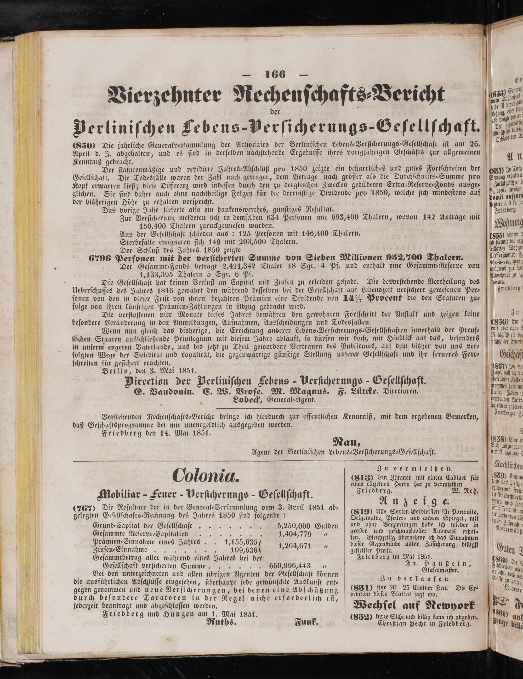 (850) Die jährliche Generalverſammlung der Actionairs der Berliniſchen Lebens-Verſicherungs-Geſellſchaft iſt am 26.