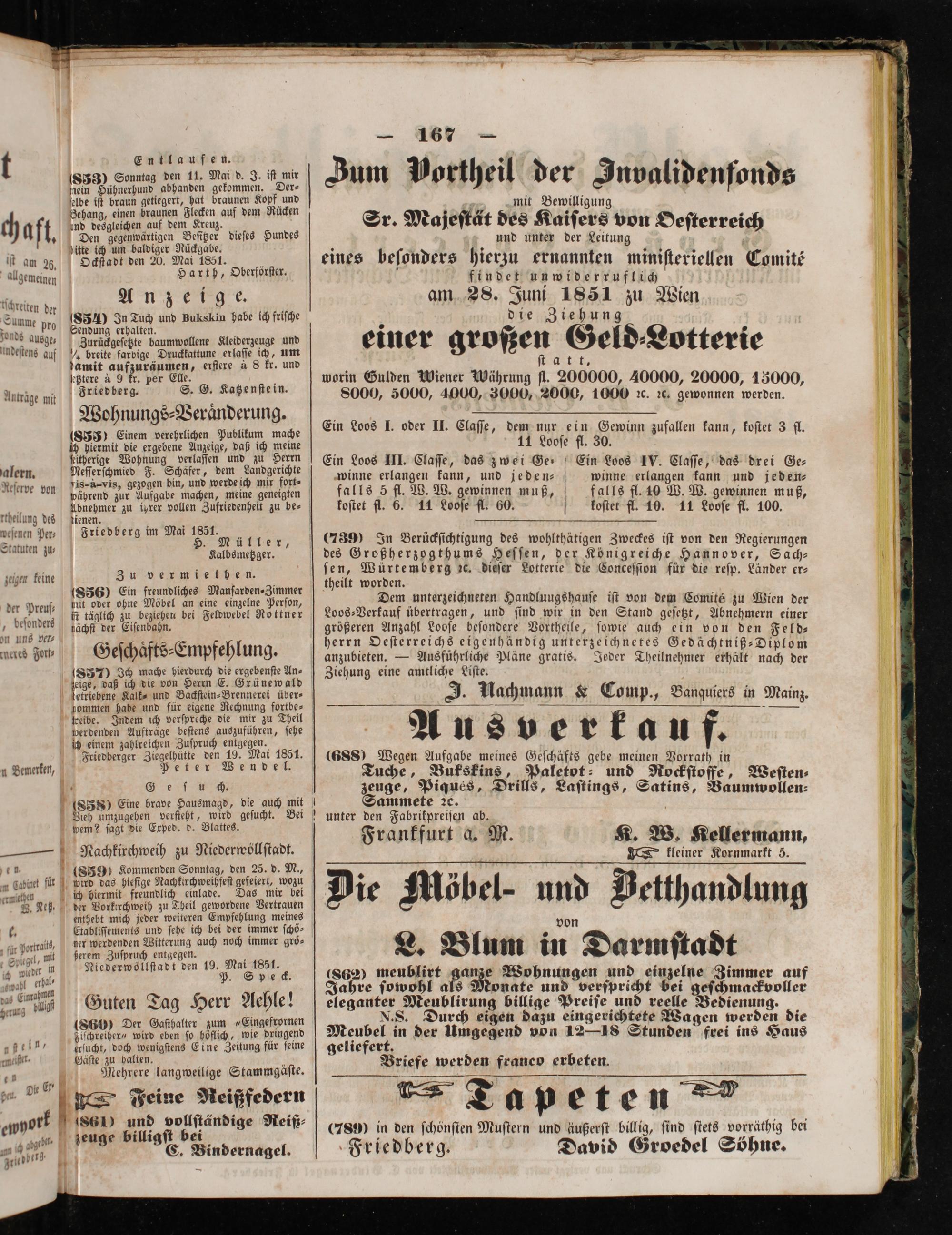 (862) meublirt ganze Wohnungen und einzelne Zimmer auf Jahre ſowohl als Monate und verſpricht bei geſchmackvoller eleganter Meublirung billige Preiſe und reelle Bedienung. N. S. Durch eigen dazu eingerichtete Wagen werden die . in der Umgegend von 12—18 Stunden frei ins Haus geliefert. Briefe werden franeo erbeten.
