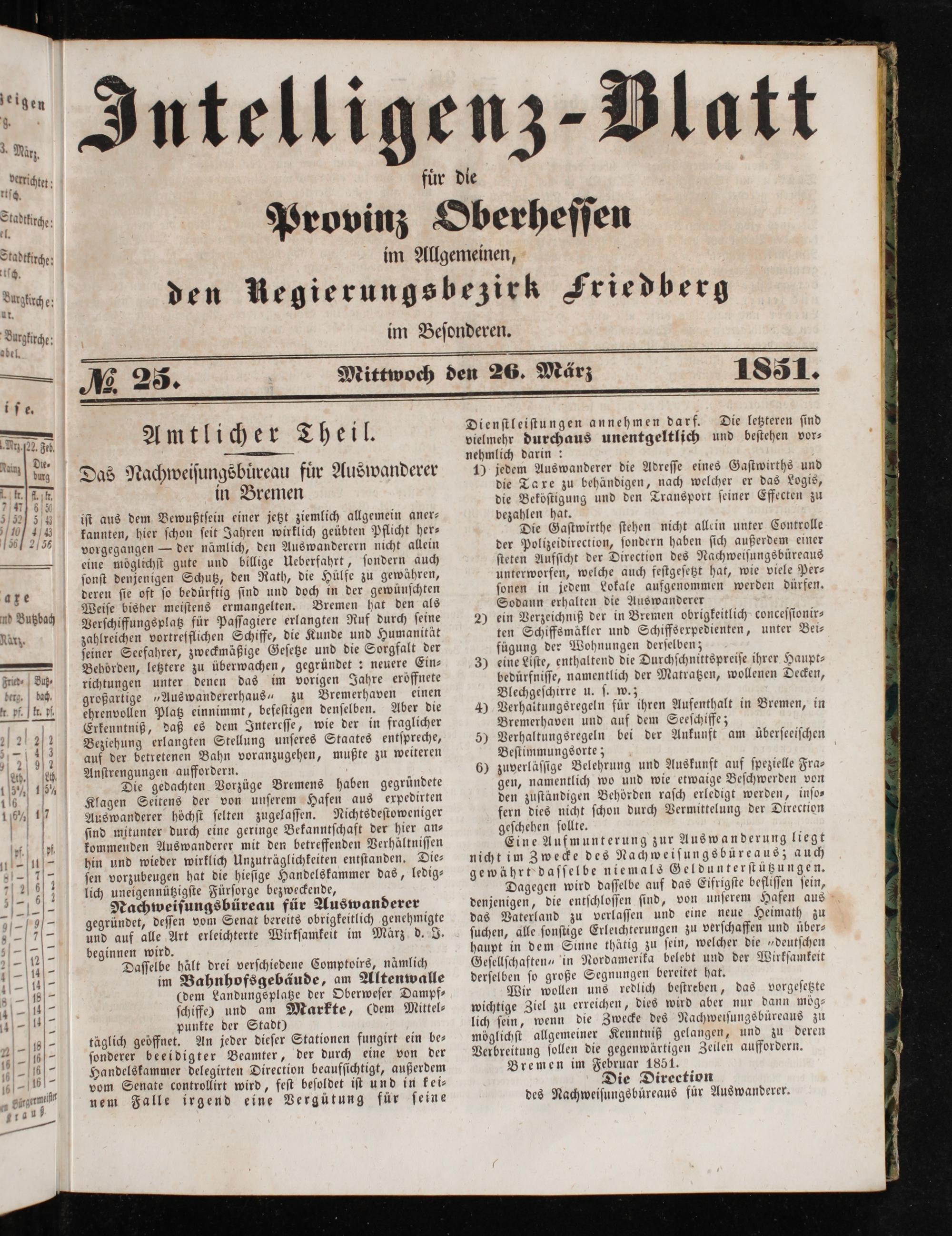 Nachweiſungsbüreau für Auswanderer gegründet, deſſen vom Senat bereits obrigkeitlich genehmigte und auf alle Art erleichterte Wirkſamkeit im März d. J. beginnen wird.