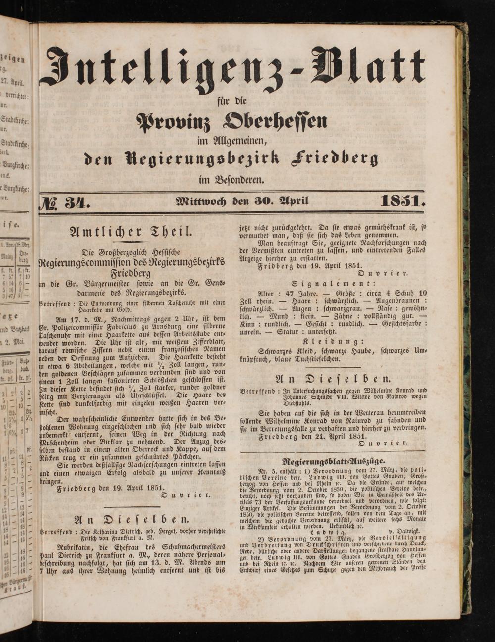 ſollende Wilhelmine Konrad von Rainrod zu fahnden und ſie im Betretungsfalle zu verhaften und hierher zu verbringen. Friedberg den 21. April 1851. Ouvrier.