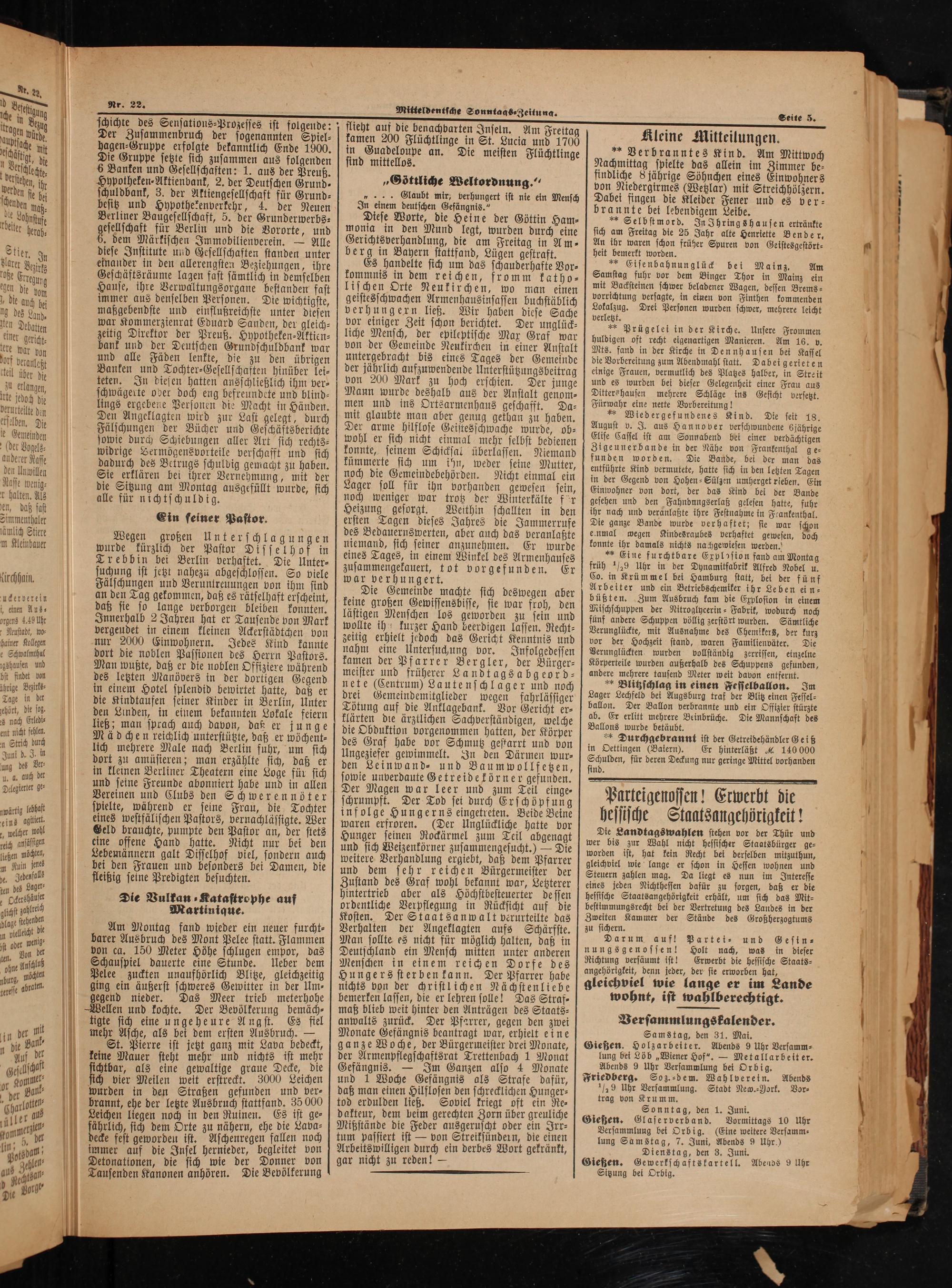 Am Montag fand wieder ein neuer furcht⸗ barer Ausbruch des Mont Pelee statt. Flammen von ca. 150 Meter Höhe schlugen empor, das Schauspiel dauerte eine Stunde. Ueber dem Pelee zuckten unaufhörlich Blitze, gleichzeitig ging ein äußerst schweres Gewitter in der Um⸗ gegend nieder. Das Meer trieb meterhohe Der Bevölkerung bemäch⸗ tigte sich eine ungeheure Angst. Es fiel mehr Asche, als bei dem ersten Ausbruch.—