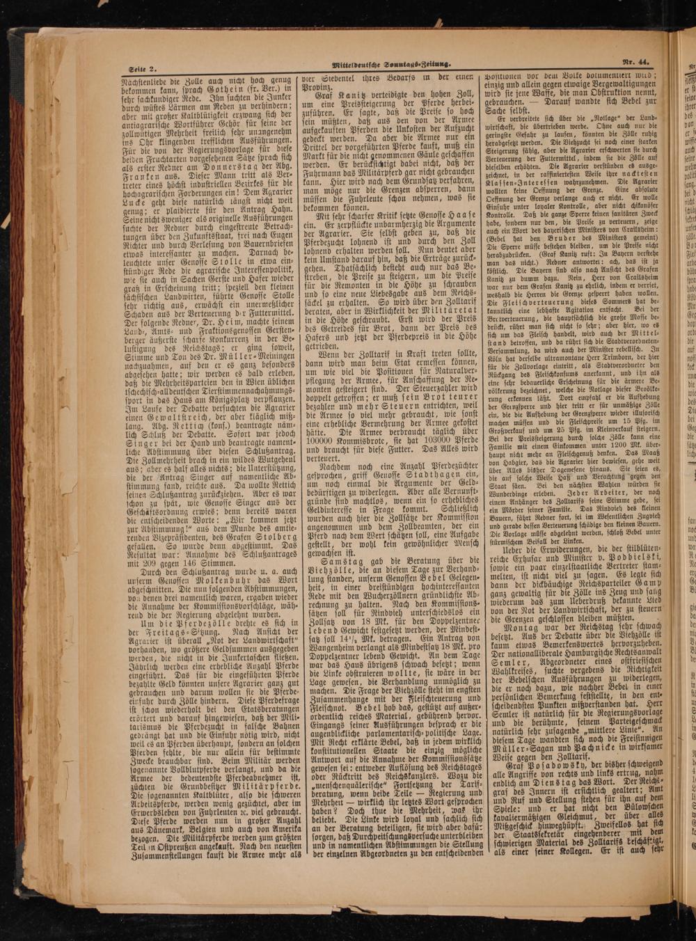 Nächstenliebe die Zolle auch nicht hoch genug bekommen kann, sprach Gothein(fr. Ver.) in sehr sachkundiger Rede. Ihn suchten die Junker durch wüstes Lärmen am Reden zu verhindern; aber mit großer Kaltblütigkeit erzwang sich der antiagrarische Wortführer Gehör für seine der zollwütigen Mehrheit freilich sehr unangenehm ins Ohr klingenden trefflichen Ausführungen. Für die von der Regierungsvorlage für diese beiden Fruchtarten vorgesehenen Sätze sprach sich als erster Redner am Donnerstag der Abg. Franken aus. Dieser Mann tritt als Ver⸗ treter eines höchst industriellen Bezirkes für die hochagrarischen Forderungen ein! Dem Agrarier Lucke geht diese natürlich längst nicht weit genug; er plaidierte für den Antrag Hahn. Seine nicht sweniger als originelle Ausführungen suchte der Redner durch eingestreute Betrach—⸗ tungen über den Zukunftsstaat, frei nach Eugen Richter und durch Verlesung von Bauernbriefen etwas interessanter zu machen. Darnach be⸗ leuchtete unser Genosse Stolle in etwa ein⸗ stündiger Rede die agrarische Interessenpolitik, wie sie auch in Sachen Gerste und Hafer wieder graß in Erscheinung tritt; speziell den kleinen sächsischen Landwirten, führte Genosse Stolle sehr richtig aus, erwächst ein unermeßlicher Schaden aus der Verteuerung der Futtermittel. Der folgende Redner, Dr. Heim, machte seinem Land-, Amts⸗ und Fraktionsgenossen Gersten⸗ berger äußerste scharfe Konkurrenz in der Be⸗ lustigung des Reichstags; er ging soweit, Stimme und Ton des Dr. Müller-Meiuingen nachzuahmen, auf den er es ganz besonders abgesehen hatte; wir werden es bald erleben, daß die Mehrheitsparteien den in Wien üblichen tschechisch-alldeutschen Tierstimmennachahmungs⸗ sport in das Haus am Königsplatz verpflanzen. Im Lause der Debatte versuchten die Agrarier einen Gewaltstreich, der aber kläglich miß⸗ lang. Abg. Rettich(kons.) beantragte näm⸗ lich Schluß der Debatte. Sofort war jedoch Singer bei der Hand und beantragte nament⸗ liche Abstimmung über diesen Schlußantrag. Die Zollmehrheit brach in ein wildes Wutgeheul aus; aber es half alles nichts; die Unterstützung, die der Antrag Singer auf namentliche Ab⸗ stimmung fand, reichte aus. Da wollte Rettich seinen Schlußantrag zurückziehen. Aber es war schon zu spät, wie Genosse Singer aus der Geschäftsordnung erwies; denn bereits waren die entscheidenden Worte:„Wir kommen jetzt zur Abstimmung!“ aus dem Munde des amtie⸗ renden Vizepräsidenten, des Grafen Stolberg gefallen. So wurde denn abgestimmt. Das Resultat war: Annahme des Schlußautrages mit 209 gegen 146 Stimmen.