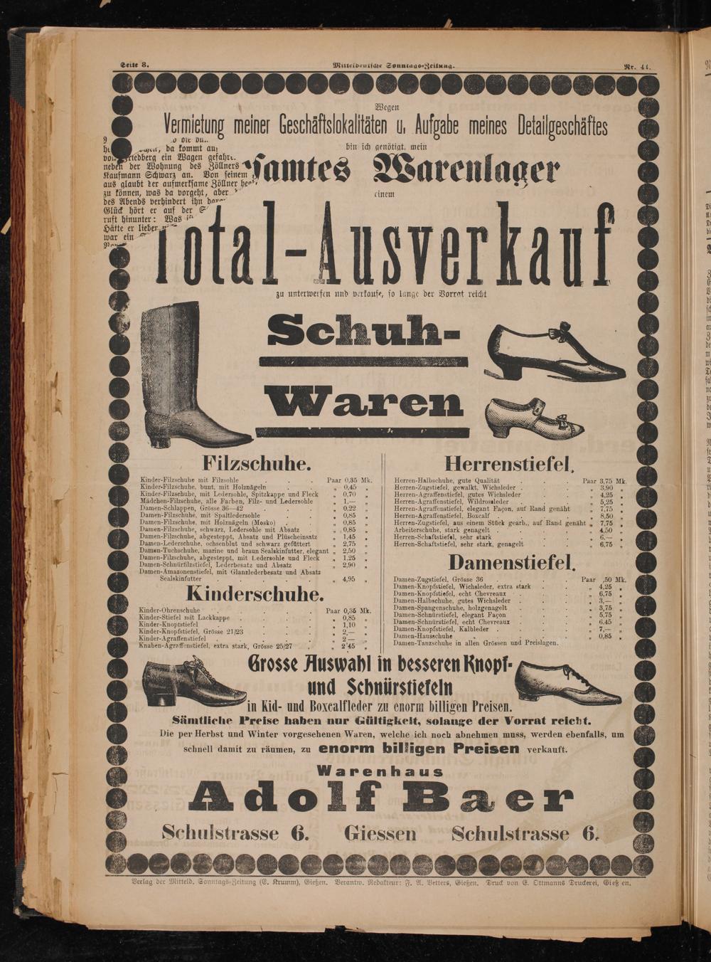 Verlag der Mitteld. Sonntags-Zeitung(E. Krumm), Gießen. Verantw. Redakteur: F. A. Vetters, Gießen. Druck von E. Ottmanns Druckerei, teh en.