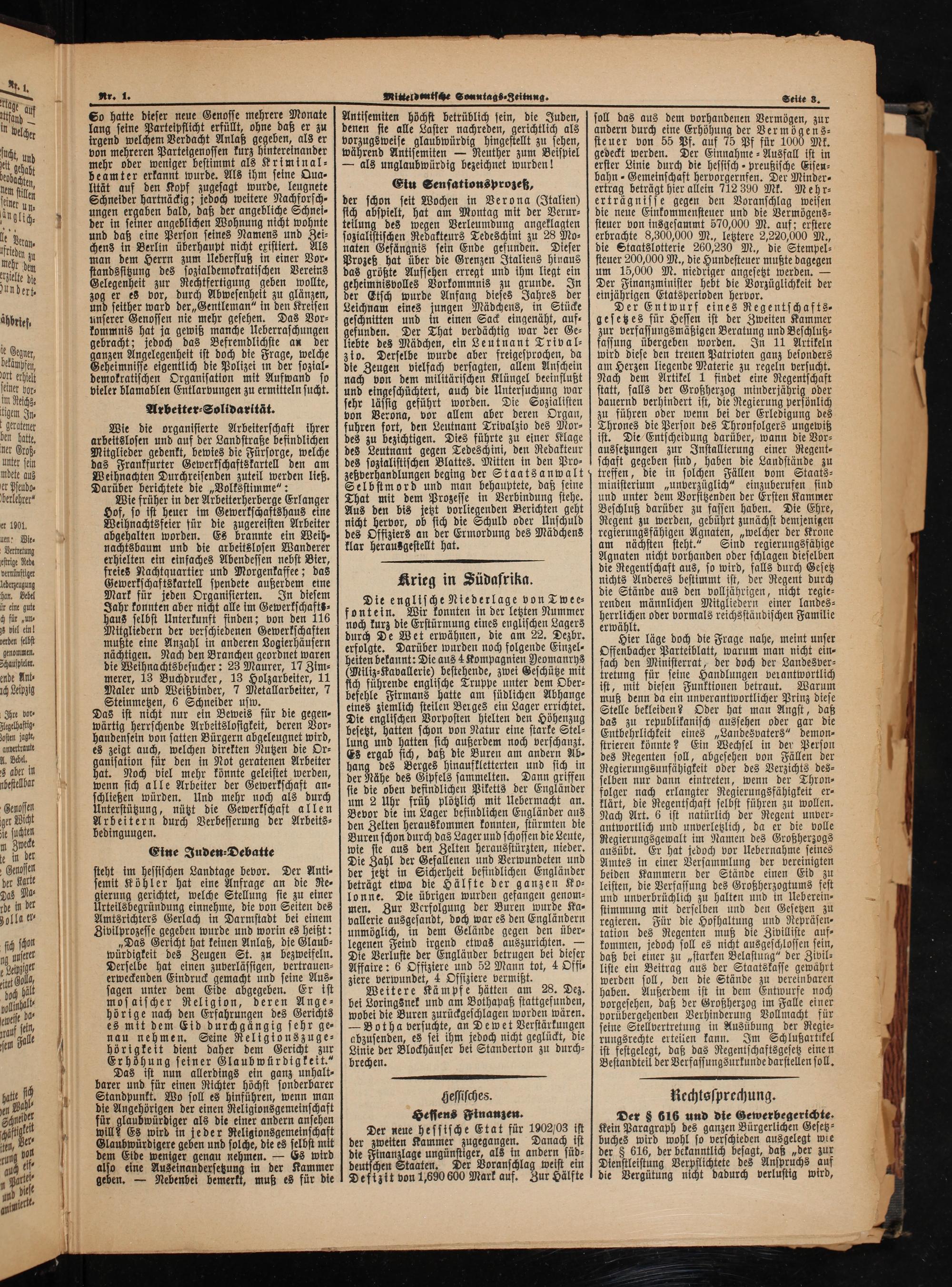 Der neue hessische Etat für 1902/03 ist der zweiten Kammer zugegangen. Danach ist die Finanzlage ungünstiger, als in andern süd⸗ deutschen Staaten. Der Voranschlag weist ein Defizit von 1,690 600 Mark auf. Zur Hälfte