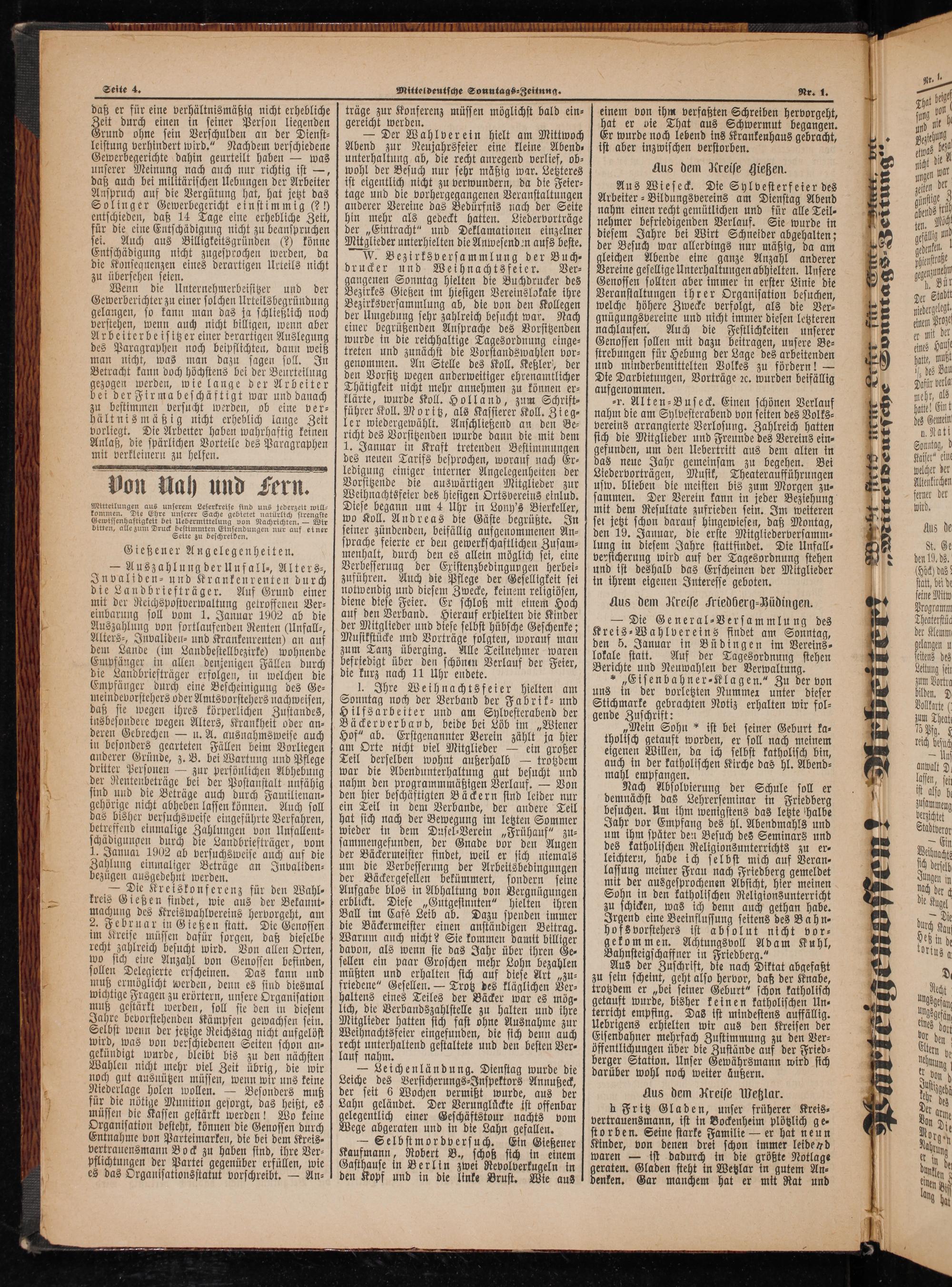 — Der Wahlverein hielt am Mittwoch Abend zur Neujahrsfeier eine kleine Abend⸗ unterhaltung ab, die recht anregend verlief, ob— wohl der Besuch nur sehr mäßig war. Letzteres ist eigentlich nicht zu verwundern, da die Feier⸗ tage und die vorhergegangenen Veranstaltungen anderer Vereine das Bedürfnis nach der Seite hin mehr als gedeckt hatten. Liedervorträge der„Eintracht“ und Deklamationen einzelner Mitglieder unterhielten die Anwesend en aufs beste.