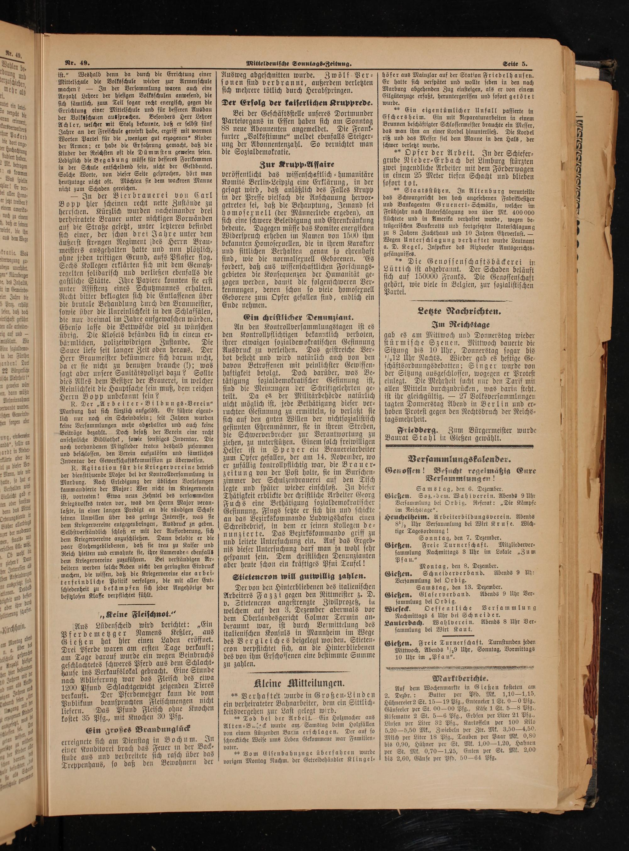 Auf dem Wochenmarkte in Gießen kosteten am 2. Dezbr.: Butter per Pfd. Mk. 1,10— 1,15, Hühnereier 2 St. 15— 19 Pfg., Enteneter 1 St. 0—0 Pfg., Gänseeier per St. 00— 00 Pfg., Käse 1 St. 5—8 Pfg., Käsematte 2 St. 5—6 Pfg., Erbsen per Liter 21 Pfg., Linsen per Liter 32 Pfg., Kartoffeln per 100 Kilo 5,20— 5,50 Mk., Zwiebeln per Ztr. Mk. 3,50—4,50, Milch per Liter 18 Pfg., Tauben per Paar Mk. 0,80 bis 0,90, Hühner per St. Mk. 1,00—1,20, Hahnen Enten per St. Mk. 2,00 bis 2,60, Gänse per Pfd. 50—64 Pfg.
