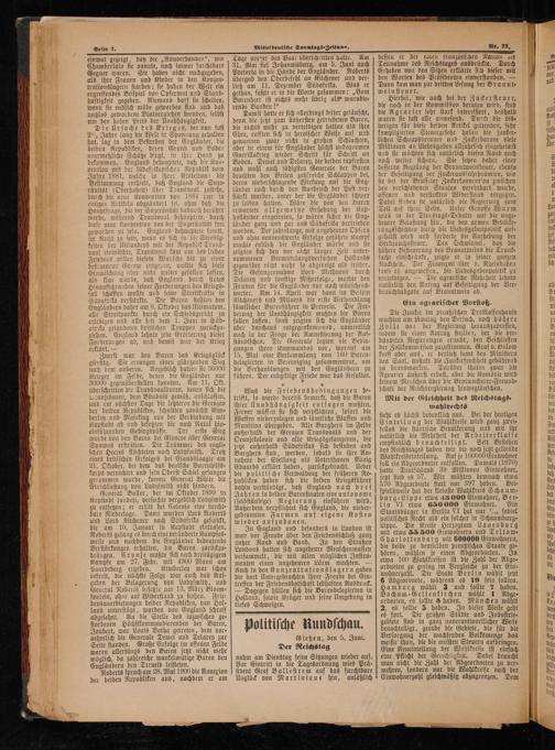 Politische Rundschau. Gießen, den 5. Juni. Der Reichstag nahm am Dienstag seine Sitzungen wieder auf. Vor Eintritt in die Tagesordnung wies Prä⸗