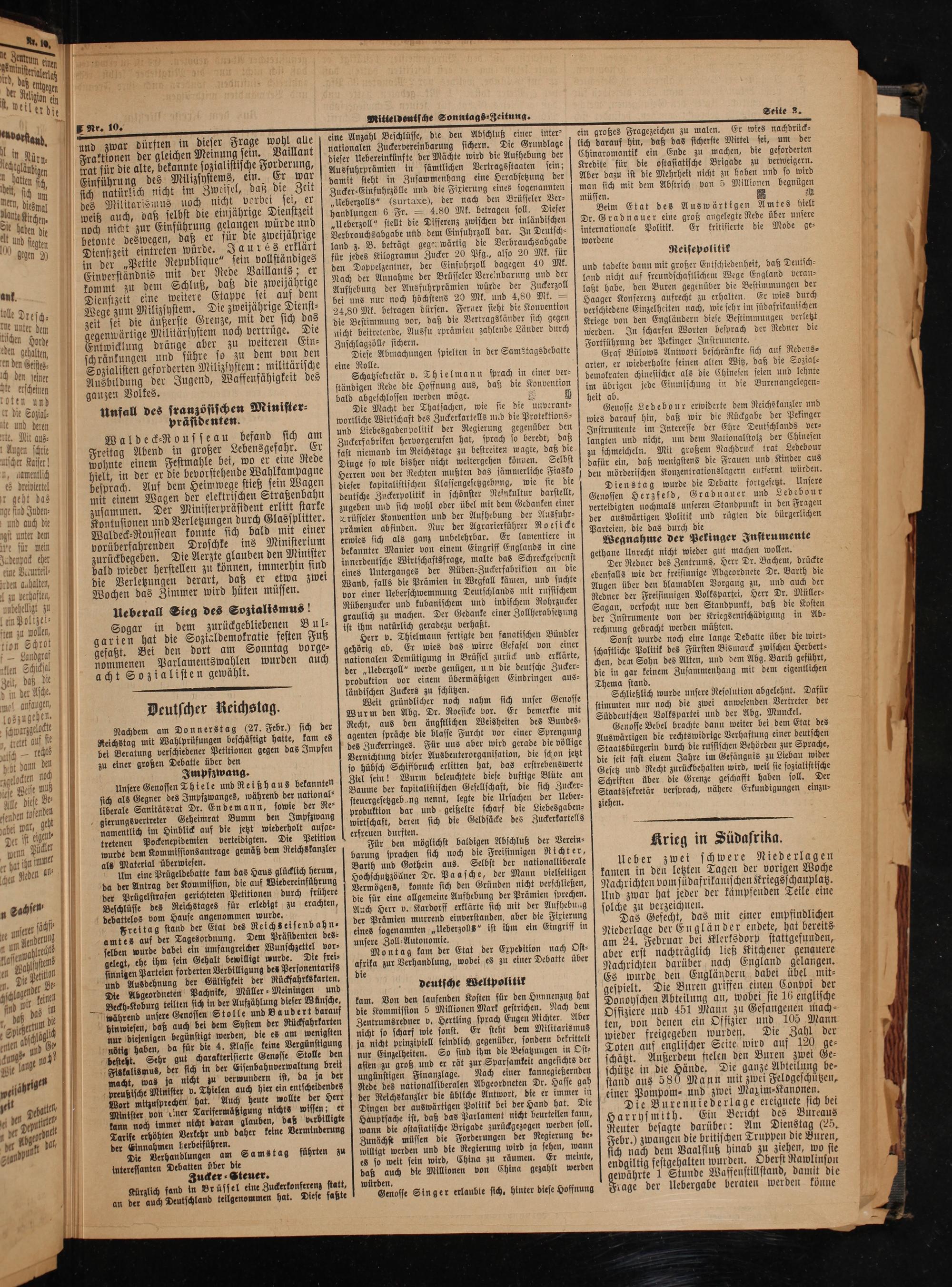 De N E 2 4 5 cker tretenen Pockenepidemien verteidigten. Die Petition. N. 5 5 5 wenn Nute. wurde dem Kommissionsantrage gemäß dem Reichskanzler Für den möglichst baldigen Abschluß der Lerein⸗ Krieg in Südafrika. hat ihn imm 5 als Material überwiesen. barung sprachen sich noch die Freisiunigen Richter,. 5 1 eden all 9 Um eine Prügeldebatte lam bas Haus glücklich herum, Barth und Gothein aus. Selbst der nationalliberale Ueber zwei schwere Niederlagen g da der Antrag der Kommission, die auf Wiedereinführung Hochschutzzönner Dr. Paasche, der Mann vielseitigen] kamen in den letzten Tagen der vorigen Woche . der Prügelstrafen gerichteten Petitionen durch frühere] Vermögens, konnte sich den Gründen nicht verschließen, Nachrichten vom südafrikanischen Kriegsschauplatz. 1 gachsen⸗ Beschlüsse des Reichstages für erledigt zu erachten,] die für eine allgemeine Aufhebung der Prämien sprechen. Und zwar hat jeder der kämpfenden Teile eine aa debattelos vom Haufe angenommen wurde. Auch Herr v. Kardorff erklärte sich mit der Aufhebung solche zu verzeichnen. „ Ulserer sächst Freitag stand der Etat des Reichseisenbahn⸗ der Prämien murrend einverstanden, aber die Fixierung Das Gefecht, das mit einer empfindlichen le Aendern!“ tes auf der Tagesordnung. Dem Präsidenten des⸗ eines sogenannten„Ueberzolls“ ist ihm ein Eingriff in] Niederlage d Engländer endet berei a un ee, amte 90. 1 lter der. unsere Zoll Autanemie Niederlage der Engländer endete, hat bereits Kosserwahl* selben wurde dabei ein umfangre cher Wunschzettel vor⸗ Man tag kam der tat der Erpekltien nach Of: am 24. Februar bei Klerksdorp statigefunden, 0 Wahlsoten. gelegt, ehe ihm sein Gehalt bewilligt wurde. Die res aft ˖ Oste aber erst nachträglich ließ Kitchener genauere el 8 Pell 1 sinnizen Parteien forderten Verbilligung des Personentarifs afrika zur Verhandlung, wobei es zu einer Debatte über] Nachrichten darüber nach England 4192 25 1. A er B. und Ausdehnung der Gültigkeit der Rückfahrtskarten. die s wurde den Engländern dabei ü 1 Aealogen feilen 1 Die Abgeordneten Pachnite, Müller ⸗ Meiningen und deutsche Weltpolitik Es wur Di 2 zuglälferte en d sind* 1 Beckh⸗Koburg teilten sich in der Aufzählung dieser Wünsche.] kam. Von den laufenden Kosten für den Hunnenzug hat Pögoysche i Aühlnng au, wobei fte 16 falt der , daß un di ö während unsere Genossen Stolle und ODaubert darauf] die Kommission 5 Millionen Mark gestrichen. Nach dem onoyschei g Au, englische ö