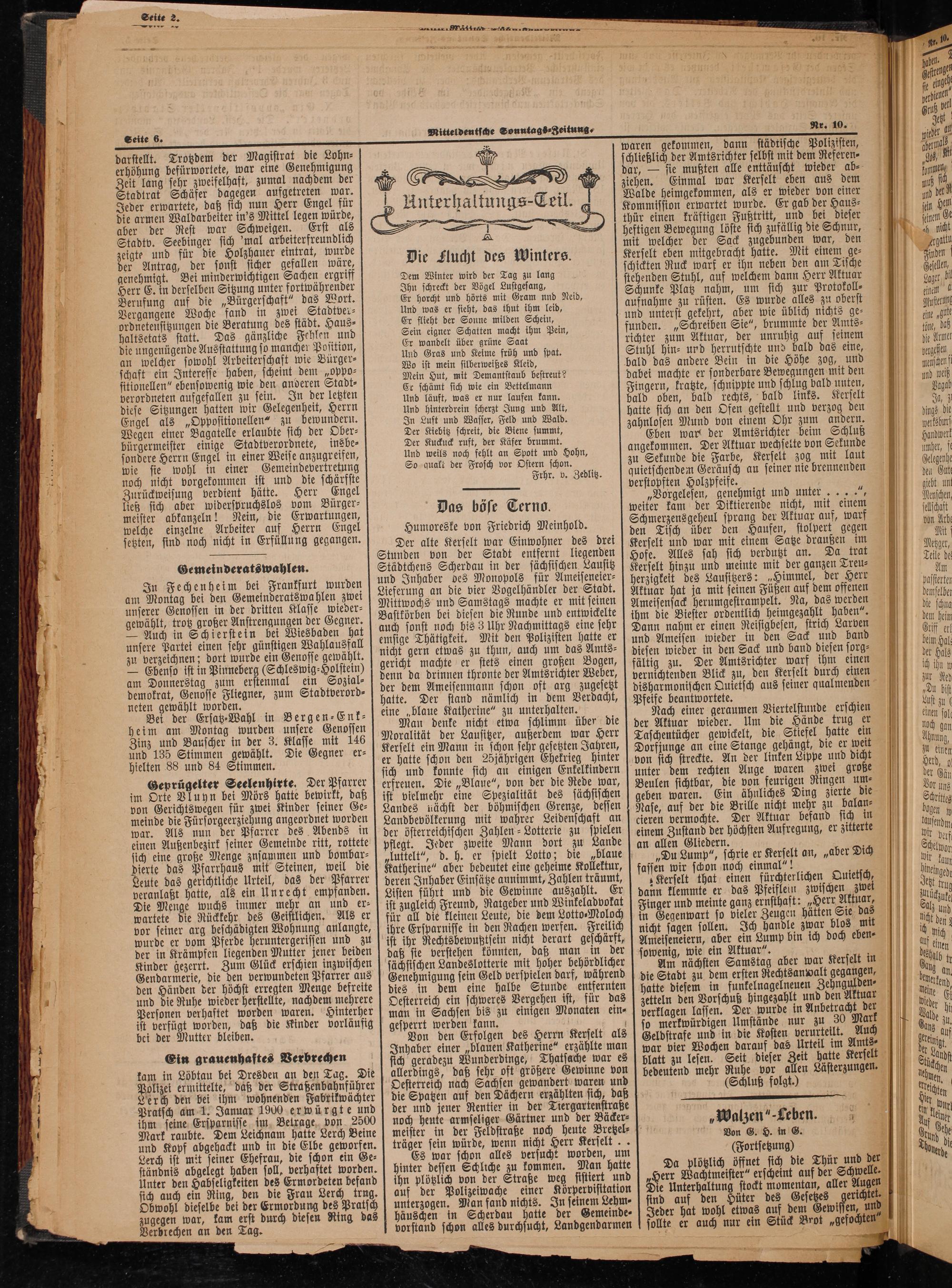 Von G. H. in G. (Fortsetzung) 4 Da plötzlich öffnet sich die Thür und der „Herr Wachtmeister“ erscheint auf der Schwelle. Die Unterhaltung stockt momentan, aller Auge sind auf den Hüter des Gesetzes gerich