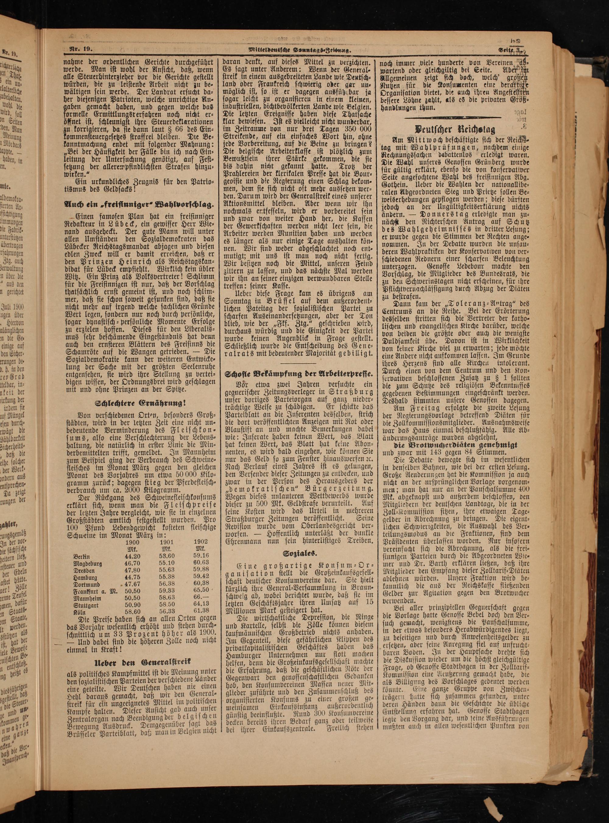 Am Mittwoch beschäftigte sich der Reichs⸗ tag mit Wahlprüfungen, nachdem einige Rechnungssachen debattenlos erledigt waren. Die Wahl unseres Genossen Grünberg wurde für gültig erklärt, ebenso die von konservattver Seite angefochtene Wahl des freisinnigen Abg. Gothein. Ueber die Wahlen der nattonallibe⸗ ralen Abgeordneten Sieg und Prietze sollen Be⸗ weiserhebungen gepflogen werden; diese dürften jedoch an der Ungültigkeitserklärung nichts ändern.— Donnerstag erledigte man zu⸗ nächst den Richterschen Antrag auf Schutz des Wahlgeheimnisses in dritter Lesung; er wurde gegen die Stimmen der Rechten ange⸗ nommen. In der Debatte wurden die unsau⸗ beren Wahlpraktiken der Konservativen von ver⸗ schiedenen Rednern einer scharfen Beleuchtung unterzogen. Genosse Ledebour machte den Vorschlag, die Mitglieder des Bundesrats, die zu den Schwerinstagen nicht erscheinen, für ihre Pflichtvernachlässigung durch Abzug der Diäten zu bestrafen.