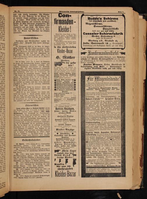 da wirst Du reell bedient, da kannst Du Dir unter 100 und aber 100 Anzügen, vom billigsten bis zum feinsten, ebenso einzelne Röcke, Hosen, Westen, Hüte, Stiefel, Cravatten, Hemden, Kragen ꝛc. ꝛc., für Land und