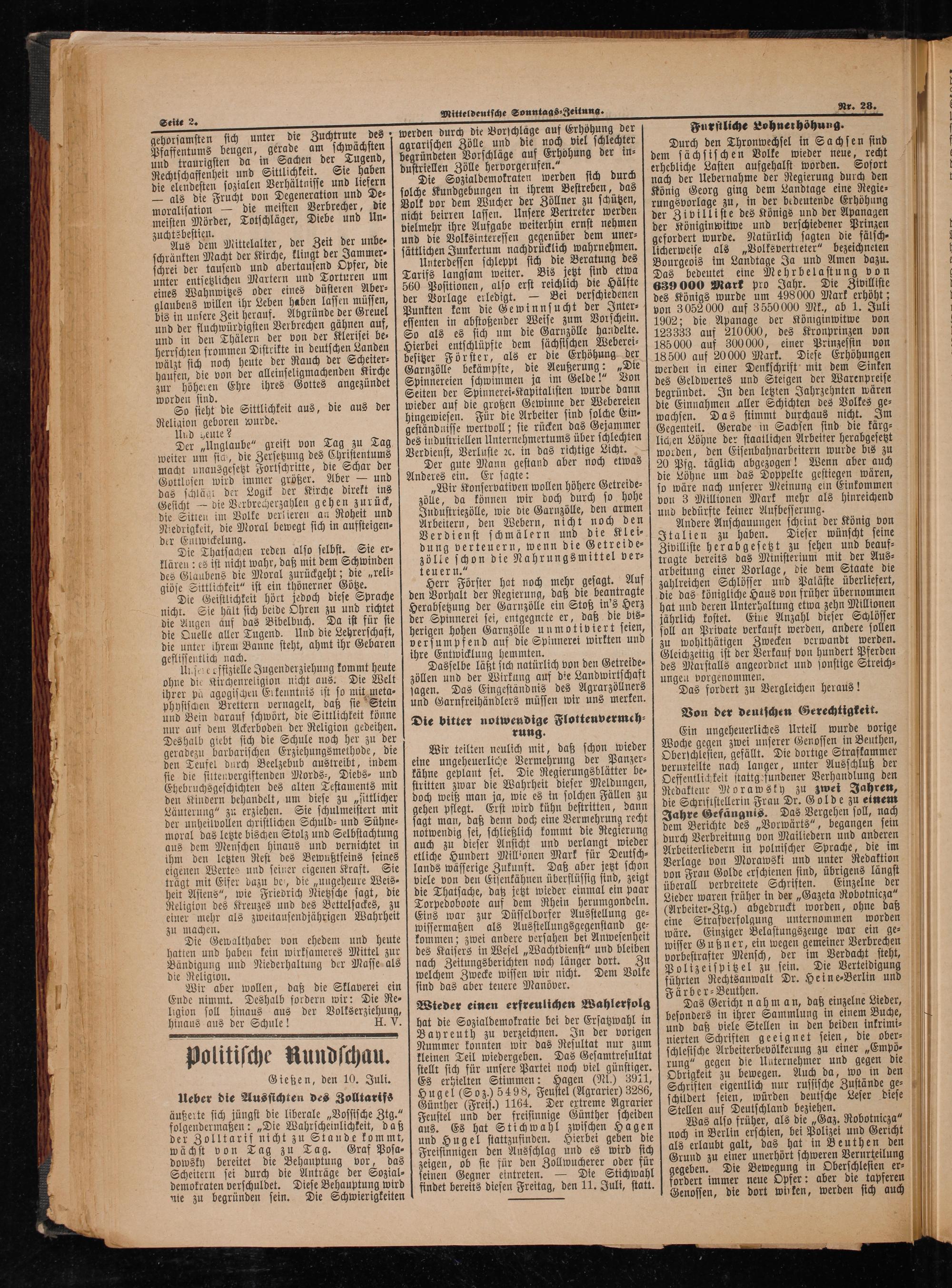 hat die Sozialdemokratie bei der Ersatzwahl in Bayreuth zu verzeichnen. In der vorigen Nummer konnten wir das Resultat nur zum kleinen Teil wiedergeben. Das Gesamtresultat stellt sich für unsere Partei noch viel günstiger. Es erhielten Stimmen: Hagen(Il.) 3941, Hugel(Soz.) 5498, Feustel(Agrarier) 3286, Günther(Freis.) 1164. Der extreme Agrarier Feustel und der freisinnige Günther scheiden aus. Es hat Stichwahl zwischen Hagen und Hugel stattzufinden. Hierbei geben die Freisinnigen den Ausschlag und es wird sich zeigen, ob sie für den Zollwucherer oder für seinen Gegner eintreten.— Die Stichwahl