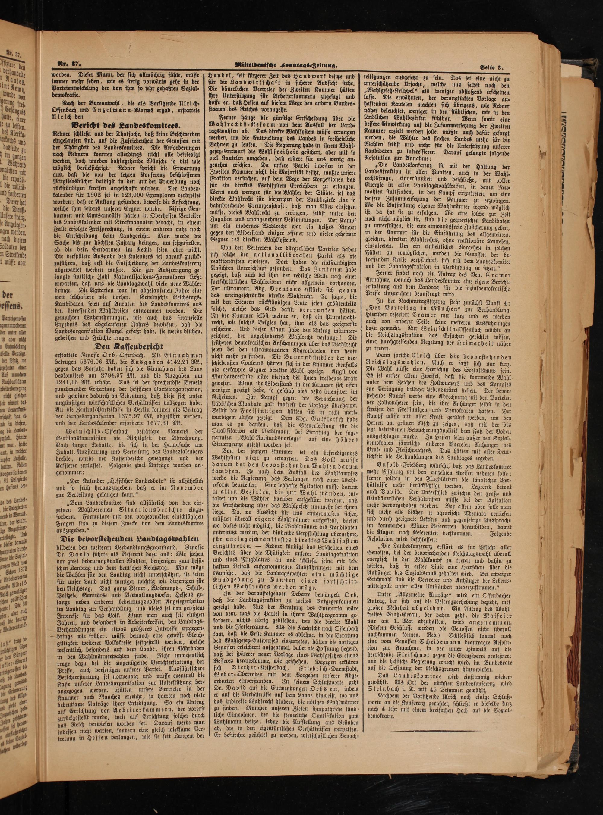 Redner schließt aus der Thatsache, daß keine Beschwerden eingelaufen find, auf die Zufriedenheit der Genossen mit der Thätigkeit des Landeskomitees. Die Anforderungen nach Rednern konnten allerdings nicht alle befriedigt werden, doch wurden dahingehende Wünsche so viel wie möglich berücksichtigt. Redner spricht die Erwartung aus, daß die von der letzten Konferenz beschlossenen Mitgliedsbücher baldigst in den mit der Erwerbung noch rückständigen Kreisen angeschafft würden. Der Landes⸗ kalender für 1902 sei in 123,000 Exemplaren verbreitet worden; daß er Anklang gefunden, beweise die Anfechtung, welche ihm seitens unserer Gegner wurde. Eifrige Gen⸗ darmen und Amtsanwälte hätten in Oberhessen Verteiler des Landeskalender mit Strafmandaten bedacht, in einem Falle erfolgte Freisprechung, in einem anderen ruhe noch die Entscheidung beim Landgericht. Man werde die Sache bis zur höchsten Instanz bringen, um festzustellen, ob die betr. Gendarmen im Rechte seien oder nicht. Die verspätete Ausgabe des Kalenders sei darauf zurück⸗ zuführen, daß erst die Entscheidung der Landeskonferenz abgewartet werden mußte. Die zur Ausfertigung ge⸗ langte stattliche Zahl Naturalisations⸗Formularen ließe erwarten, daß uns die Landtagswahl viele neue Wähler bringe. Die Agitation war im abgelaufenen Jahre eine weit lebhaftere wie vorher. Gewünschte Reichstags⸗ Kandidaten seien auf Anraten des Landeskomitees aus den betreffenden Wahlkreisen entnommen worden. Die gemachten Wahrnehmungen, wie auch das finanzielle Ergebnis des abgelaufenen Jahres bewiesen, daß die Landesorganisation Wurzel gefaßt habe, sie werde blühen, gedeihen und Früchte tragen.