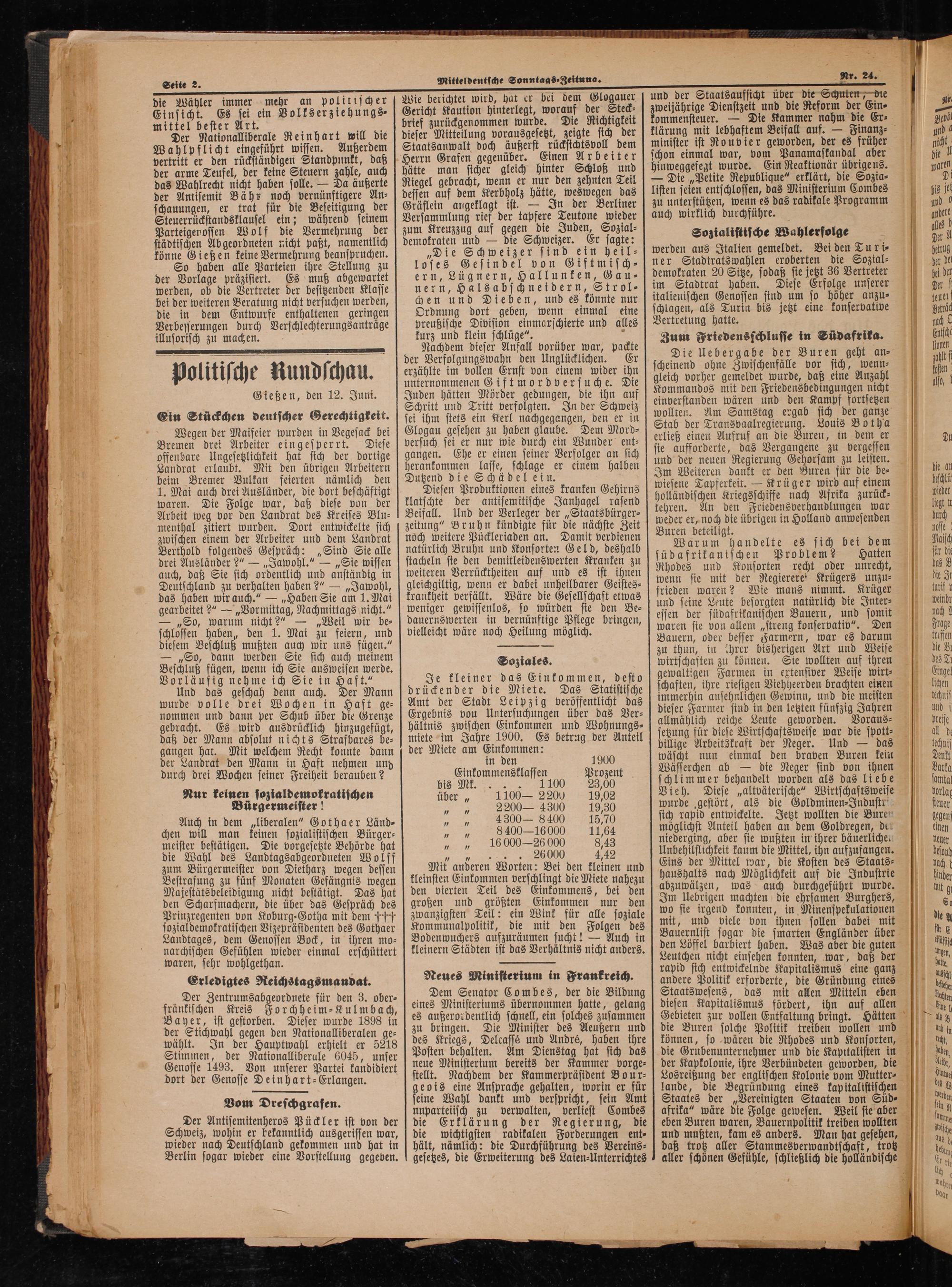 Je kleiner das Einkommen, desto drückender die Miete. Das Statistische Amt der Stadt Leipzig veröffentlicht das Ergebnis vou Untersuchungen über das Ver⸗ hältnis zwischen Einkommen und Wohnungs- miete im Jahre 1900. Es betrug der Anteil der Miete am Einkommen: