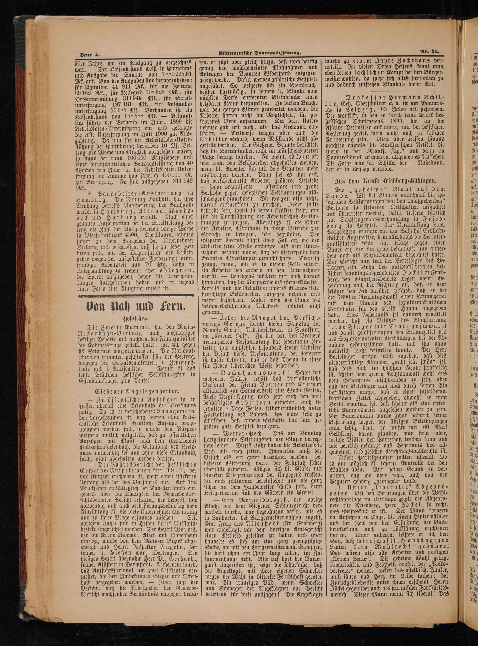 — Der Jahresbericht der hessischen Gewerbe-Inspektionen für 1901, der vor Kurzem erschtenen ist, weist einen stärkeren Umfang als der des Vorjahres auf. Auf 182 Druckseiten einschließlich der Tabellen wird ein⸗ gehend über die Thätigkeit der Gewerbe-Auf⸗ sichtsbeamten Bericht erstattet, der beweist, wie notwendig und auch verbesserungsbedürftig diese Einrichtung ist, die viele Unternehmer als unnütz und zu ihrer Plage erfunden ansehen.— Seit vorigem Jahre sind in Hessen fünf Aufsichts⸗ bezirke eingerichtet worden. Der Bezirk Worms, der die Kreise Worms, Alzey und Oppenheim umfaßt, wurde von dem Mainzer Bezirk abge⸗ zweigt und Herrn Inspektor Engeln, der früher in Gießen war, übertragen. Den hiesigen Bezirk übernahm Herr Dr. Gerhardt, früher Assistent in Darmstadt. Außerdem wurde das Aufsichtspersonal um zwei Assistenten ver⸗ mehrt, die den Inspektionen Gießen und Offen⸗ bach beigegeben wurden.— Zwar sagt der Bericht, daß die Arbeitgeber der Gewerbe⸗ Aufsicht wachsendes Verständnis entgegen bräch⸗
