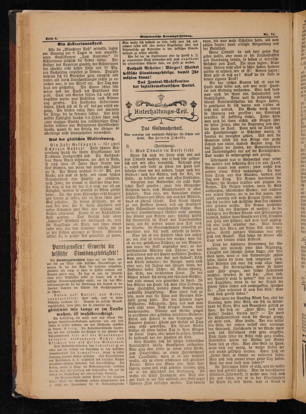 Wenn sich auch die Leute nicht viel aus dem Oswald machten, war er doch sehr zuthun⸗ lich und mit allen freundlich. Anfangs ging er rechts und links zu jedem ins Haus und besuchte einen um den andern, fragte nach den Kindern; nach den Gütern, nach der Art, die Felde. zu bestellen und nach allen Umständen. Vorzeiten war Goldenthal ein recht statt⸗ liches Dorf gewesen; zwar kein übergroßer Reichtum darin, doch Wohlhabenheit in allen Häusern. Nun aber, mit Ausnahme einiger reichen Bauern und Wirte, wie auch des Müllers, staud es überall schlecht. Das Elend schaute zu den Fenstern hinaus, und am Feuerherd kochte Schmalhans ungeschmalzte Suppe. Von hundert Haushaltungen schickten wohl zwanzig ihre Kinder zum Betteln aus; sechszig halfen sich kümmerlich im Druck von Schuldenlasten durch, und die andern waren zum Teil noch im Stande, die Gemeindesteuern ordentlich zu entrichten und sich wohl aufrecht zu halten.