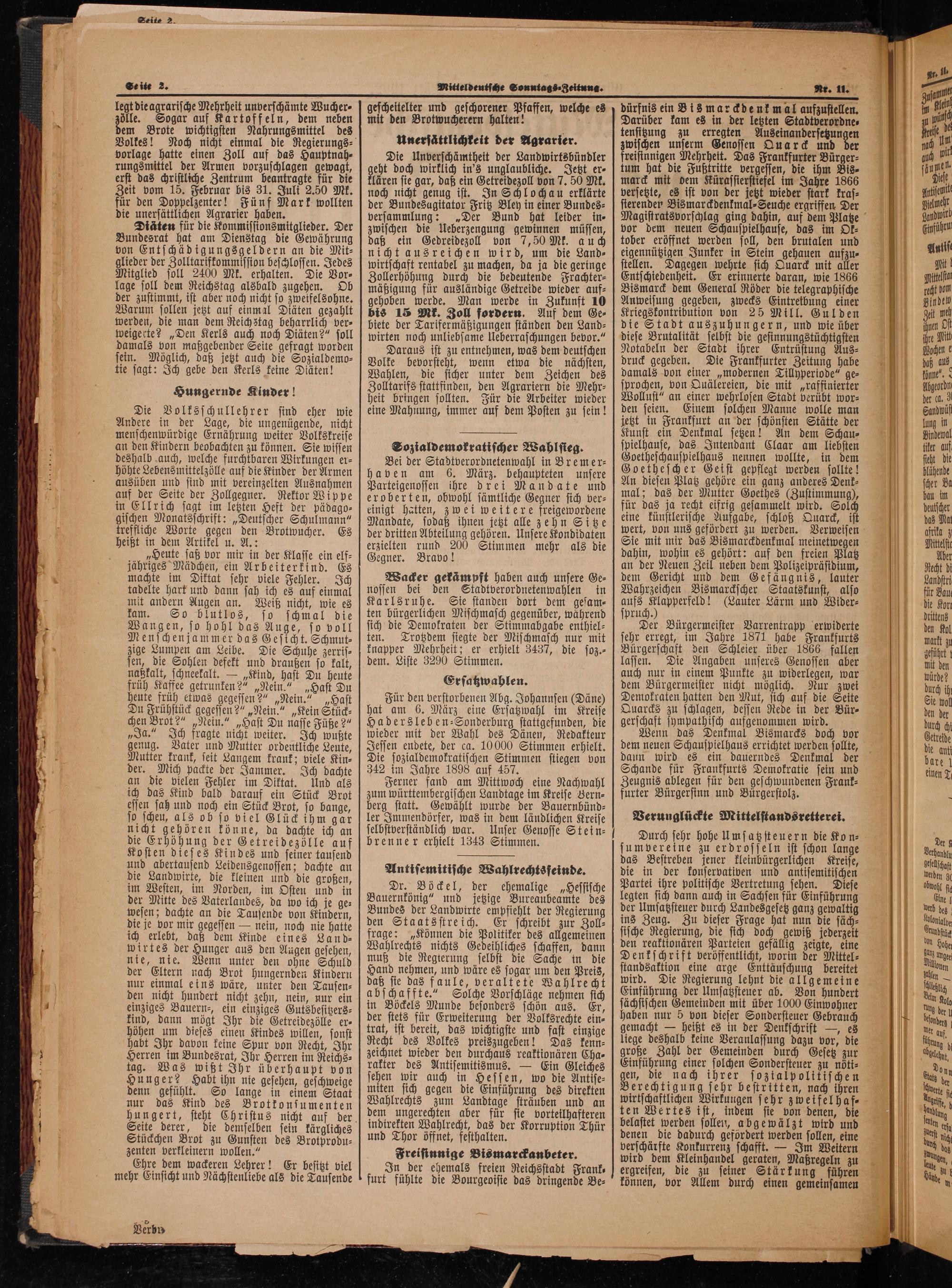 „Heute saß vor mir in der Klasse ein elf⸗ jähriges Mädchen, ein Arbeiterkind. Es machte im Diktat sehr viele Fehler. Ich tadelte hart und dann sah ich es auf einmal mit andern Augen an. Weiß nicht, wie es kam. So blutlos, so schmal die Wangen, so hohl das Auge, so voll Menschenjammer das Gesicht. Schmut⸗ zige Lumpen am Leibe. Die Schuhe zerris⸗ sen, die Sohlen defekt und draußen so kalt, naßkalt, schneekalt.—„Kind, hast Du heute früh Kaffee getrunken?“„Nein.“„Hast Du heute früh etwas gegessen?“„Nein.“„Hast Du Frühstück gegessen?“„Nein.“„Kein Stück⸗ chen Brot?“„Nein.“„Hast Du nasse Füße?“ „Ja.“ Ich fragte nicht weiter. Ich wußte genug. Vater und Mutter ordeutliche Leute, Mutter krank, seit Langem krank; viele Kin⸗ der. Mich packte der Jammer. Ich dachte an die vielen Fehler im Diktat. Und als ich das Kind bald darauf ein Stück Brot essen sah und noch ein Stück Brot, so bange, so scheu, als ob so viel Glück ihm gar nicht gehören könne, da dachte ich an die Erhöhung der Getreidezölle auf Kosten dieses Kindes und seiner tausend und abertausend Leidensgenossen; dachte an die Landwirte, die kleinen und die großen, im Westen, im Norden, im Osten und in der Mitte des Vaterlandes, da wo ich je ge⸗ wesen; dachte an die Tausende von Kindern, die je vor mir gegessen— nein, noch nie hatte ich erlebt, daß dem Kinde eines Land⸗ wirtes der Hunger aus den Augen gesehen, nie, nie. Wenn unter den ohne Schuld der Eltern nach Brot hungernden Kindern nur einmal eins wäre, unter den Tausen⸗ den nicht hundert nicht zehn, nein, nur ein einziges Bauern-, ein einziges Gutsbesitzers⸗ kind, dann mögt Ihr die Getreidezölle er⸗ höhen um dieses einen Kindes willen, sonst habt Ihr davon keine Spur von Recht, Ihr Herren im Bundesrat, Ihr Herren im Reichs⸗ tag. Was wißt Ihr überhaupt von Hunger? Habt ihn nie gesehen, geschweige denn gefühlt. So lange in einem Staat nur das Kind des Brotkonsumenten