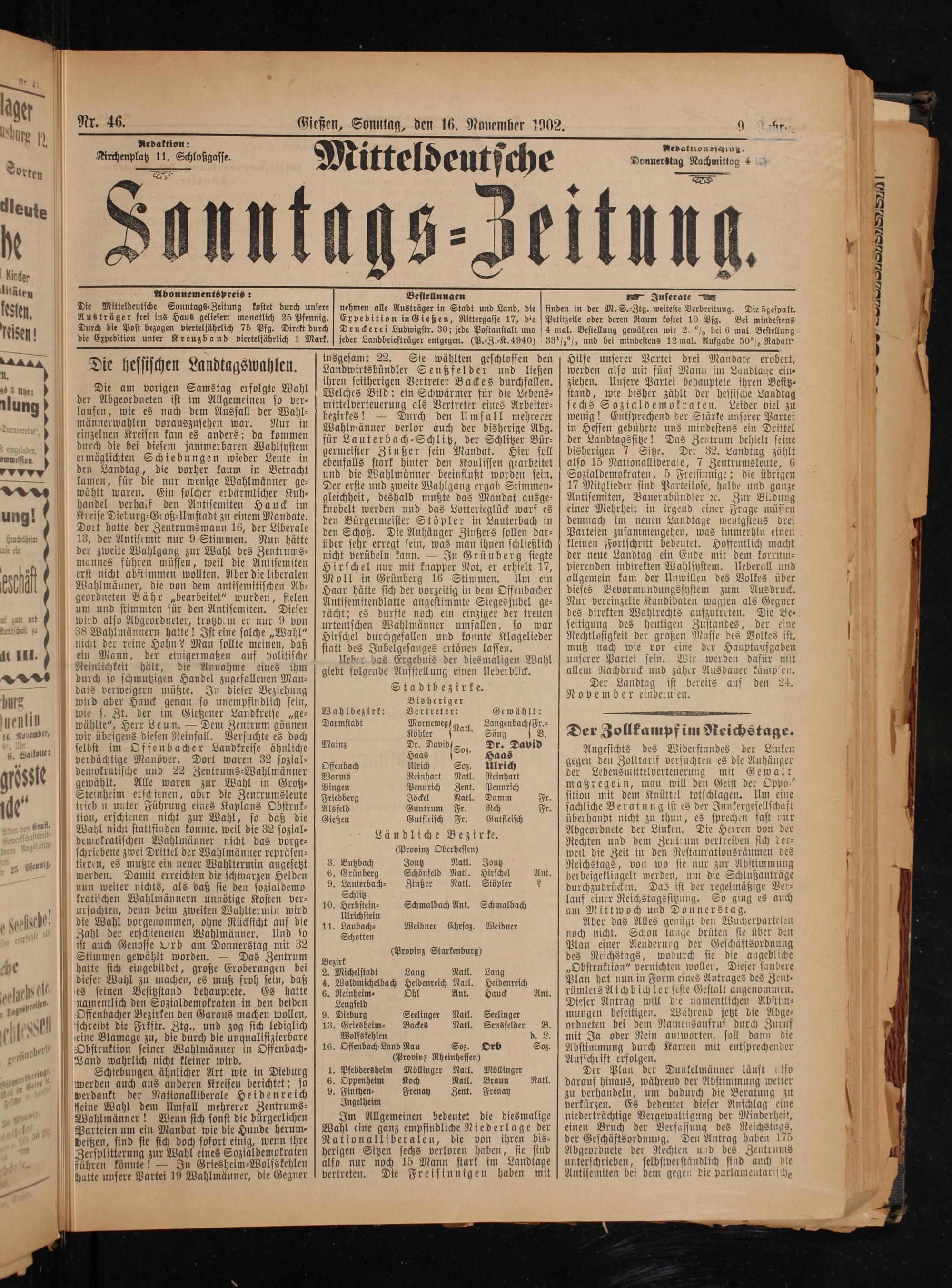 Nr. 46. Gießen, Sonntag, den 16. November 1902. 9. Vahr. 5 Redaktion: 2 Mebattton schlug. a Kirchenplatz 11, Schloßgasse. M Id sch Donnerstag Nachmittag 4 —— Mitteldeutsche