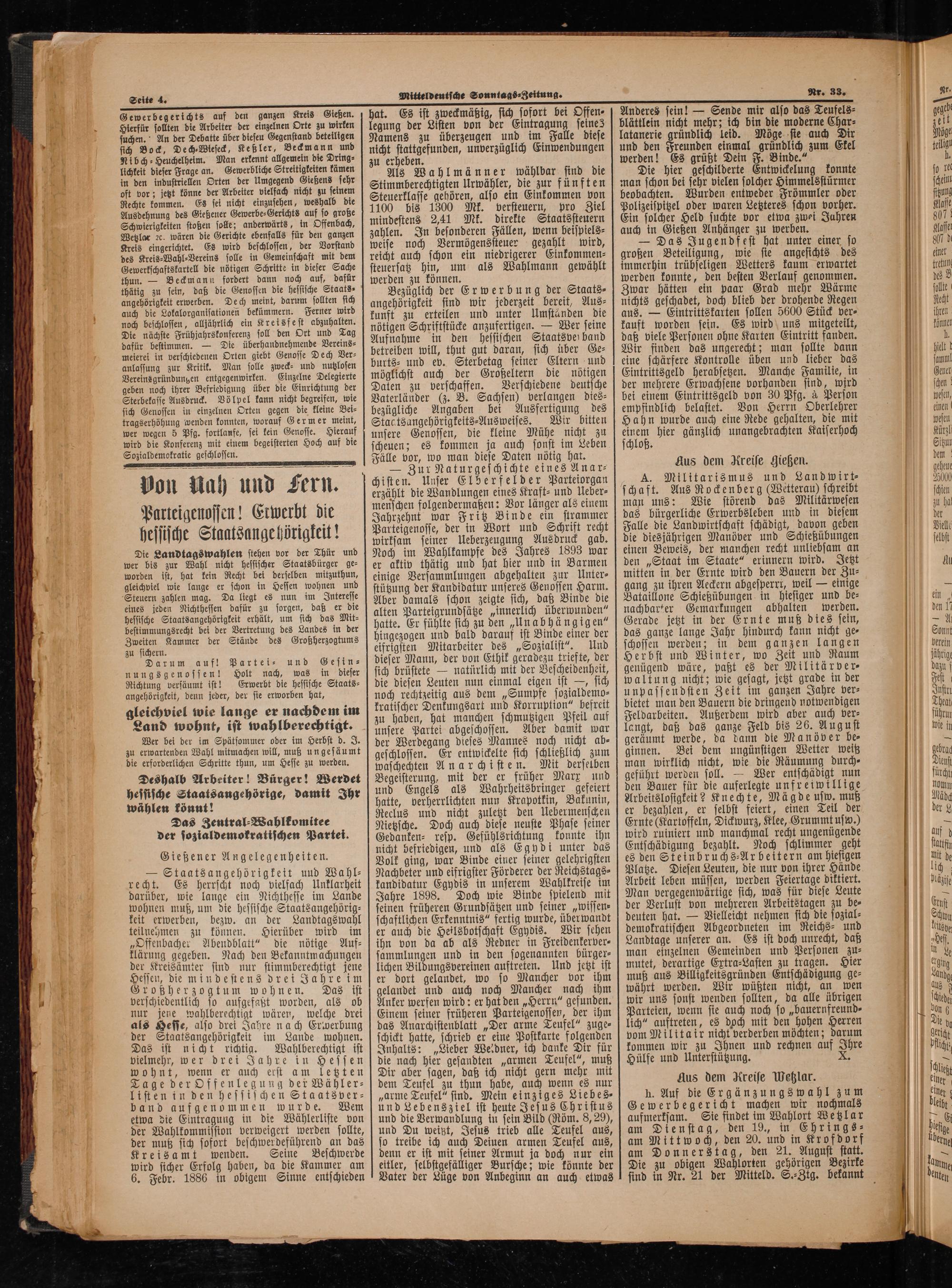 Die Landtagswahlen stehen vor der Thür und wer bis zur Wahl nicht hessischer Staatsbürger ge⸗ worden ist, hat kein Recht bei derselben mitzuthun, gleichviel wie lange er schon in Hessen wohnen und Steuern zahlen mag. Da liegt es nun im Interesse eines jeden Nichthessen dafür zu sorgen, daß er die hessische Staatsangehörigkeit erhält, um sich das Mit⸗ bestimmungsrecht bei der Vertretung des Landes in der Zweiten Kammer der Stände des Großherzogtums zu sichern.