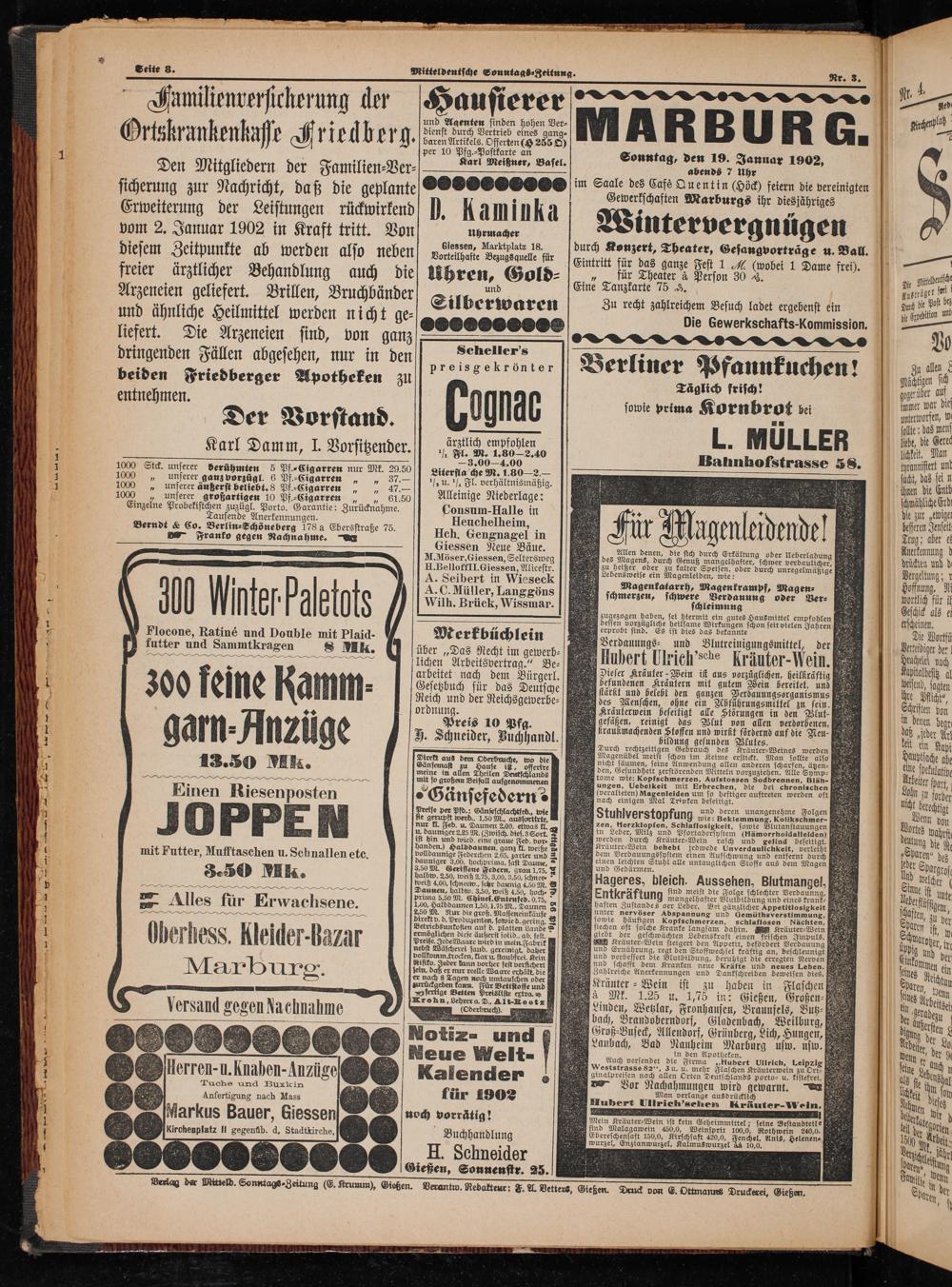 Gießen, Sonnenstr. 25. 5 5 8 5 777. Verlag der Mitteld. Sonntags⸗Zeitung(E. Krumm), Gießen. Verantw. Redakteut: F. A. Vetters, Gießen. Druck von E. Ottmanns Druckerei, Gießen.