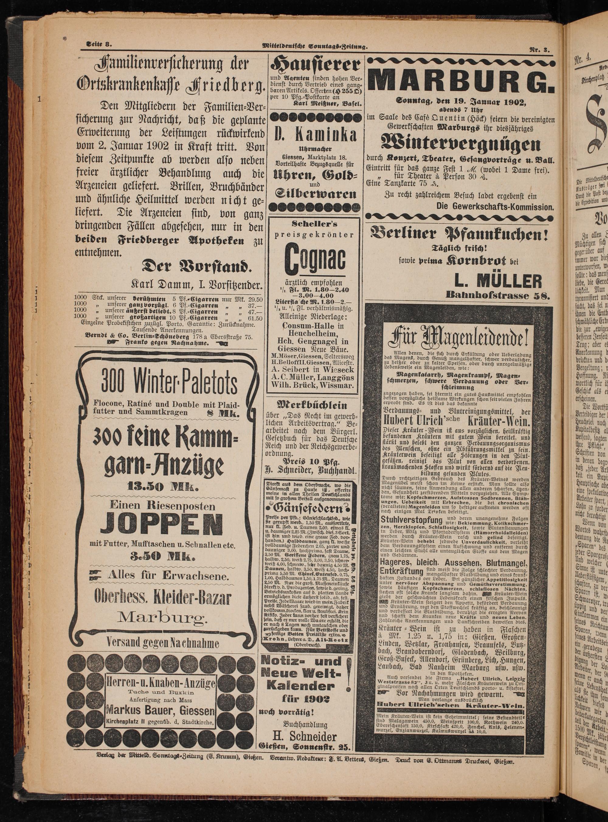 Sonntag, den 19. Januar 1902, abends 7 uhr im Saale des Cafe Quentin(Höck) feiern die vereinigten Gewerkschaften Marburgs ihr diesjähriges