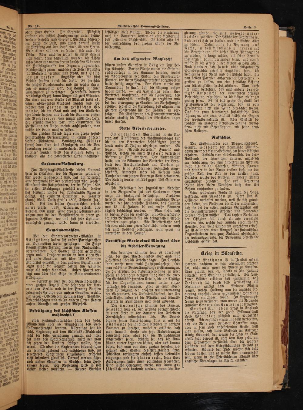 bestätigen diese Ansicht. Weder die Regierung noch die Kammern denken an eine Aenderung des geltenden Wahlrechts. Es bleibt also bei der Entrechtung der großen Masse der Be⸗ völkerung.