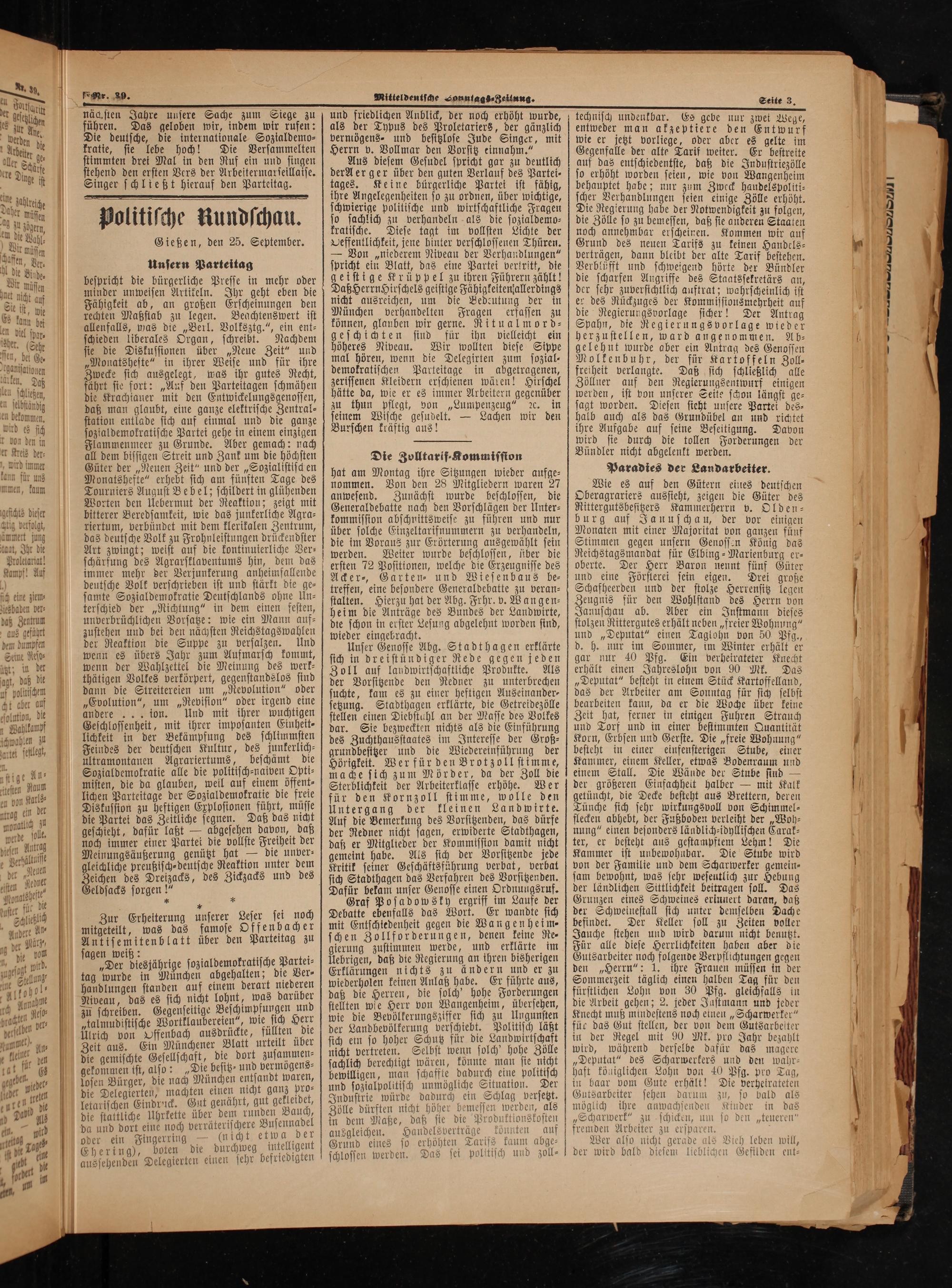 bespricht die bürgerliche Presse in mehr oder minder unweisen Artikeln. Ihr geht eben die Fähigkeit ab, an großen Erscheinungen den rechten Maßstab zu legen. Beachtenswert ist allenfalls, was die„Berl. Volksztg.“, ein ent⸗ schieden liberales Organ, schreibt. Nachdem sie die Diskussionen über„Neue Zeit“ und „Monatshefte“ in ihrer Weise und für ihre Zwecke sich ausgelegt, was ihr gutes Recht, fährt sie fort:„Auf den Parteitagen schmähen die Krachianer mit den Entwickelungsgenossen, daß man glaubt, eine ganze elektrische 5 station entlade sich auf einmal und die ganze sozialdemokratische Partei gehe in einem einzigen Flammenmeer zu Grunde. Aber gemach: nach all dem bissigen Streit und Zank um die höchsten Güter der„Neuen Zeit“ und der„Sozialistisch en Monatshefte“ erhebt sich am fünften Tage des Tourniers August Bebel; schildert in glühenden Worten den Uebermut der Reaktion; zeigt mit bitterer Beredsamkeit, wie das junkerliche Agra⸗ riertum, verbündet mit dem klerikalen Zentrum, das deutsche Volk zu Frohnleistungen drückendster Art zwingt; weist auf die kontinuierliche Ver⸗ schärfung des Agrarsklaventums hin, dem das immer mehr der Verjunkerung anheimfallende deutsche Volk verschrieben ist und stärkt die ge⸗ samte Sozialdemokratie Deutschlands ohne Un⸗ terschied der„Richtung“ in dem einen festen, unverbrüchlichen Vorsatze: wie ein Mann auf⸗ zustehen und bei den nächsten Reichstagswahlen der Reaktion die Suppe zu versalzen. Und wenn es übers Jahr zum Aufmarsch kommt, wenn der Wahlzettel die Meinung des werk⸗ thätigen Volkes verkörpert, gegenstandslos sind dann die Streitereien um„Revolution“ oder „Evolution“, um„Revision“ oder irgend eine andere... ion. Und mit ihrer wuchtigen Geschlossenheit, mit ihrer imposanten Eiuheit⸗ lichkeit in der Bekämpfung des schlimmsten Feindes der deutschen Kultur, des junkerlich⸗ ultramontanen Agrariertums, beschämt die Sozialdemokratie alle die politisch⸗naiven Opti⸗ misten, die da glauben, weil auf einem öffent⸗ lichen Parteitage der Sozialdemokratie die freie Diskussion zu heftigen Explosionen führt, müsse die Partei das Zeitliche segnen. Daß das nicht geschieht, dafür laßt— abgesehen davon, daß noch immer einer Partei die vollste Freiheit der Meinungsäußerung genützt hat— die unver⸗ gleichliche preußisch⸗deutsche Reaktion unter dem 5 7 des Dreizacks, des Zickzacks und des eldsacks sorgen!“ * 15*