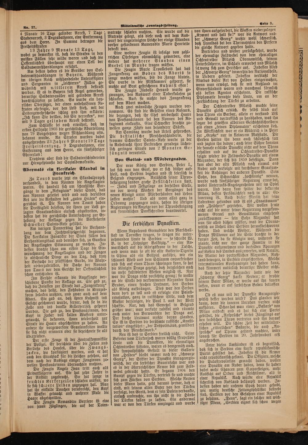 Der Ochsentreiber Milosch machte seine Dynastie gleich erblich. Er selbst blieb auf dem Thron ein Barbar, allein er verstand List und Gewalt vortrefflich zu handhaben, was ihn sogar bei gewissen albernen Geschichtsschreibern als einen„feinen Diplomaten“ erscheinen ließ. In Wirklichkeit war er ein Wüterich à la Peter der„Große“ nur in kleinerem Maßstabe. Die Serben hatten ihn denn auch schließlich satt und jagten ihn davon; auch seine Söhne konnten die famose erbliche Dynastie nicht auf dem Thron erhalten und auf die Ochsentreiber⸗Dynastie folgte wieder die Feldwebel⸗Dynastie mit einem Alexander, der sich bis 1859 befestigte. Dann kam aber der alte Milosch noch einmal ans Ruder und verfolgte mit furchtbarer Grausam⸗ keit die Anhänger der anderen Dynastie. Sein Sohn, den Schmeichler„hochsinnig“ nennen, wurde nach fünfjähriger Regierung ermordet, wobei Unterrocks⸗Angelegenheiten mit im Spiel waren. Und dann kam später der bekaunte Milan, dessen Persönlichkeit noch in aller Er⸗ innerung ist. Auch dieser Mensch hat seine Lobredner gefunden und ist als„Staatsmann“ und„Feldherr“ gepriesen. Wir wollen heute nicht auf die unter seiner Regierrung vorgekom⸗ menen Greuel und Gewalttaten eingehend zurückkommen— sein Sohn Alexander hat nun für alles büßen müssen, was die Obreno⸗ witsch an Unheil über Serbien heraufbeschworen haben. Und welche Weiber. Während die Draga Millionen auf die Seite brachte in der kurzen Zeit, da sie Königin war, während ste plante, nicht nur thre ganze Familie in die Dynastie aufzunehmen und derselben Apanagen auf Kosten des Landes auszuwerfen, will Natalie, die Mutter des vortrefflichen Alexander, Ruß⸗ land bewegen, in Serbien einzuschreiten. Welche internationalen Konsequenzen das haben kann, das kümmert natürlich derartige Weiber nicht.