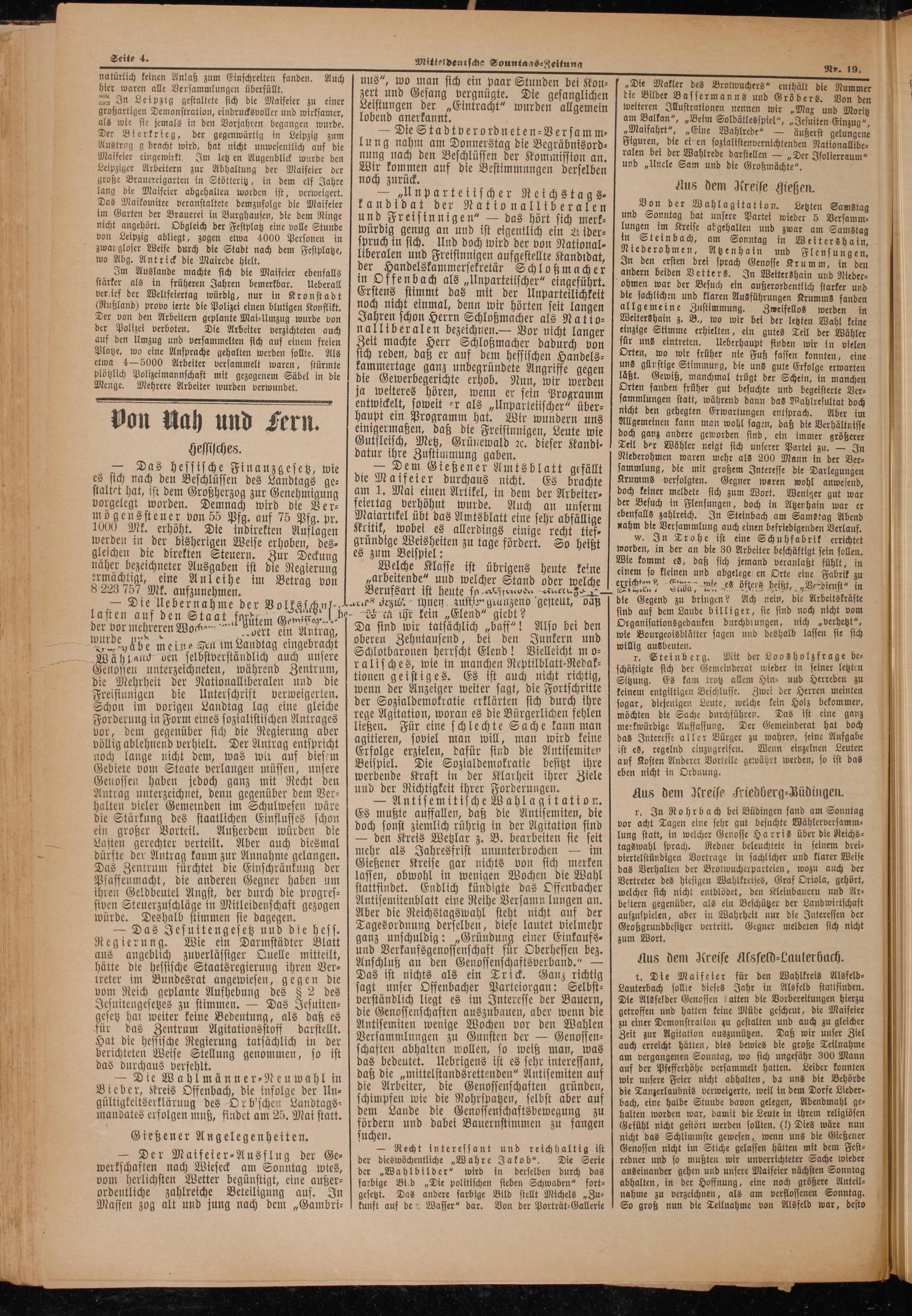 — Antisemitische Wahlagitation. Es mußte auffallen, daß die Antisemiten, die doch sonst ziemlich rührig in der Agitation sind — den Kreis Wetzlar z. B. bearbeiten sie seit mehr als Jahresfrist ununterbrochen— im Gießener Kreise gar nichts von sich merken lassen, obwohl in wenigen Wochen die Wahl stattfindet. Endlich kündigte das Offenbacher Antisemitenblatt eine Reihe Versamn lungen an. Aber die Reichstagswahl steht nicht auf der Tagesordnung derselben, diese lautet vielmehr ganz unschuldig:„Gründung einer Einkaufs⸗ und Verkaufsgenossenschaft für Oberhessen bez. Anschluß an den Genossenschaftsverband.“— Das ist nichts als ein Trick. Ganz richtig sagt unser Offenbacher Parteiorgan: Selbst— verständlich liegt es im Interesse der Bauern, die Genossenschaften auszubauen, aber wenn die Antisemiten wenige Wochen vor den Wahlen Versammlungen zu Gunsten der— Genossen⸗ schaften abhalten wollen, so weiß man, was das bedeutet. Uebrigens ist es sehr interessant, daß die„mittelstands rettenden“ Antisemiten auf die Arbeiter, die Genossenschaften gründen, schimpfen wie die Rohrspatzen, selbst aber auf dem Lande die Genossenschaftsbewegung zu fördern und dabei Bauernstimmen zu fangen suchen.