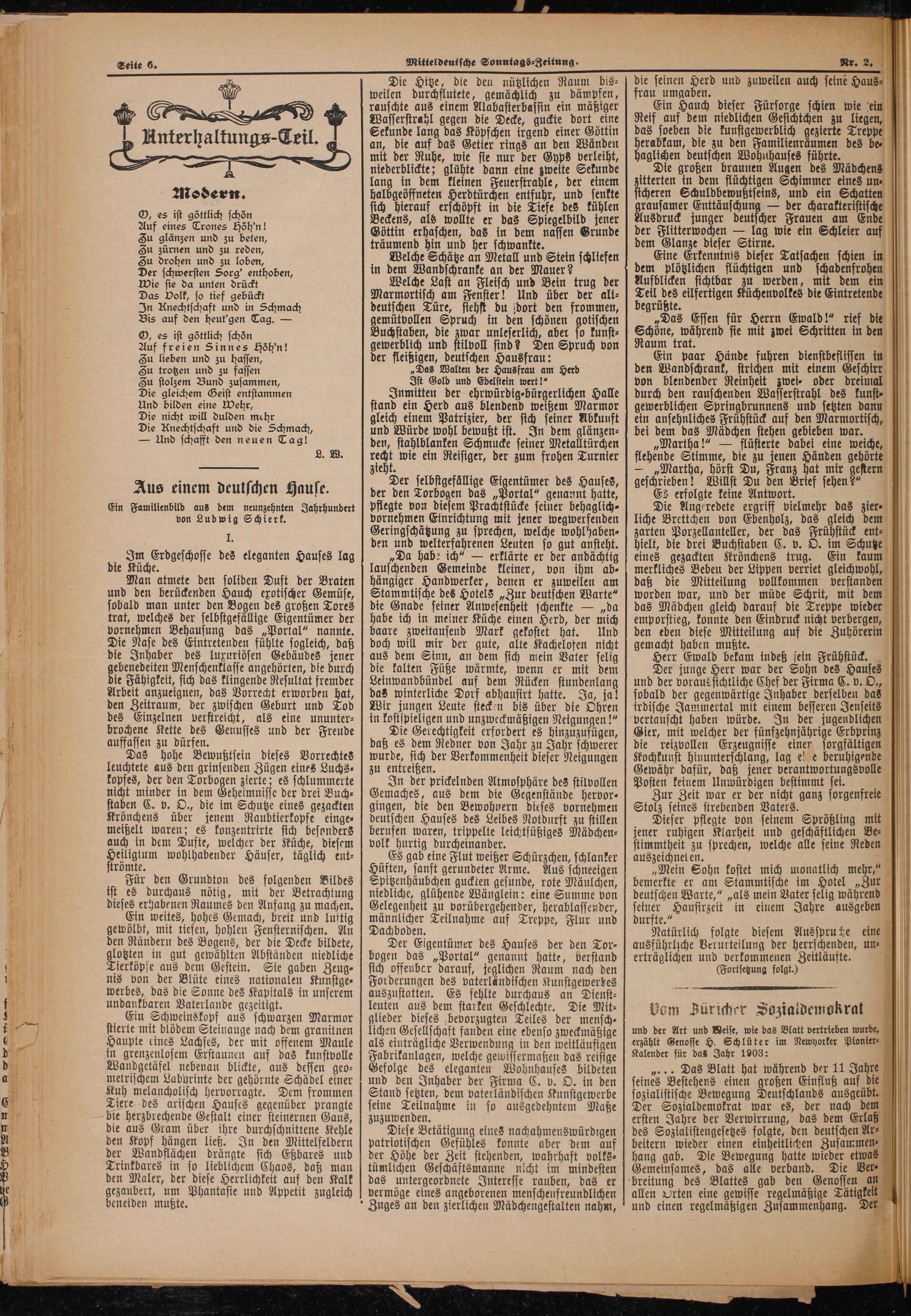 die seinen Herd und zuweilen auch seine Haus.. frau umgaben. 1 Ein Hauch dieser Fürsorge schien wie ein ö Reif auf dem niedlichen Gesichtchen zu liegen, das soeben die kunstgewerblich gezierte Treppe herabkam, die zu den Familienräumen des be- haglichen deutschen Wohuhauses führte. 10 Die großen braunen Augen des Mädchens zitterten in dem flüchtigen Schimmer eines un⸗ sicheren Schuldbewußtseins, und ein Schatten grausamer Enttäuschung— der charakteristische Ausdruck junger deutscher Frauen am Ende der Flitterwochen— lag wie ein Schleier auf dem Glanze dieser Stirne. 5 10 Eine Erkenntnis dieser Tatsachen schien in dem plötzlichen flüchtigen und schadenfrohen Aufblicken sichtbar 1 werden, mit dem ein 555 55 eilfertigen Küchenvolkes die Eintretende egrüßte. „Das Essen für Herrn Ewald!“ rief die Schöne, während sie mit zwei Schritten in den Raum trat. 5 Ein paar Hände fuhren dienstbeflissen in den Wandschrank, strichen mit einem Geschirr von blendender Reinheit zwei⸗ oder dreimal durch den rauschenden Wasserstrahl des kunst⸗ gewerblichen Springbrunnens und setzten dann ein ansehnliches Frühstück auf den Marmortisch, bei dem das Mädchen stehen gebieben war. N „Martha!“— flüsterte dabei eine weiche, flehende Stimme, die zu jenen Händen gehörte —„Martha, hörst Du, Franz hat mir gestern geschrieben! Willst Du den Brief sehen?““ Es erfolgte keine Antwort. 1 Die Angeredete ergriff vielmehr das zie. liche Brettchen von Ebenholz, das gleich dem zarten Porzellanteller, der das Frühstück ent⸗ hielt, die drei Buchstaben C. v. O. im Schutze ö eines gezackten Krönchens trug. Ein kaum merkliches Beben der Lippen verriet gleichwohl, 0 daß die Mitteilung vollkommen verstanden worden war, und der müde Schrit, mit den das Mädchen gleich darauf die Treppe wieder 1 emporstieg, konnte den Eindruck nicht verbergen, 1 den eben diese Mitteilung auf die Zuhörerin gemacht haben mußte. g 3 1 Herr Ewald bekam indeß sein Frühstück. Der junge Herr war der Sohn des Hauses und der voraus sichtliche Chef der Firma C. v. O., sobald der gegenwärtige Inhaber derselben das irdische Jammertal mit einem besseren Jenseits vertauscht haben würde. In der jugendlichen Gier, mit welcher der fünfzehnjährige Erbprinz die reizvollen Erzeugnisse einer sorgfältigen Kochkunst hinunterschlang, lag ei e beruhigende Gewähr dafür, daß jener verantwortungsvolle Posten keinem Unwürdigen bestimmt sei. 1 Zur Zeit war er der nicht ganz sorgenfreie Stolz seines strebenden Vaters. 1 0 Dieser pflegte von seinem Sprößling mit jener ruhigen Klarheit und geschäftlichen Be⸗ stimmtheit zu sprechen, welche alle seine Reden auszeichneten. 74 „Mein Sohn kostet mich monatlich mehr,“ bemerkte er am Stammtische im Hotel„Zur deutschen Warte,“„als mein Vater selig während seiner Hausirzeit in einem Jahre ausgeben durfte.“ 0 Natürlich folgte diesem Ausspru he eine ausführliche Verurteilung der herrschenden, un⸗ erträglichen und verkommenen Zeitläufte. f (Fortsetzung folgt.)