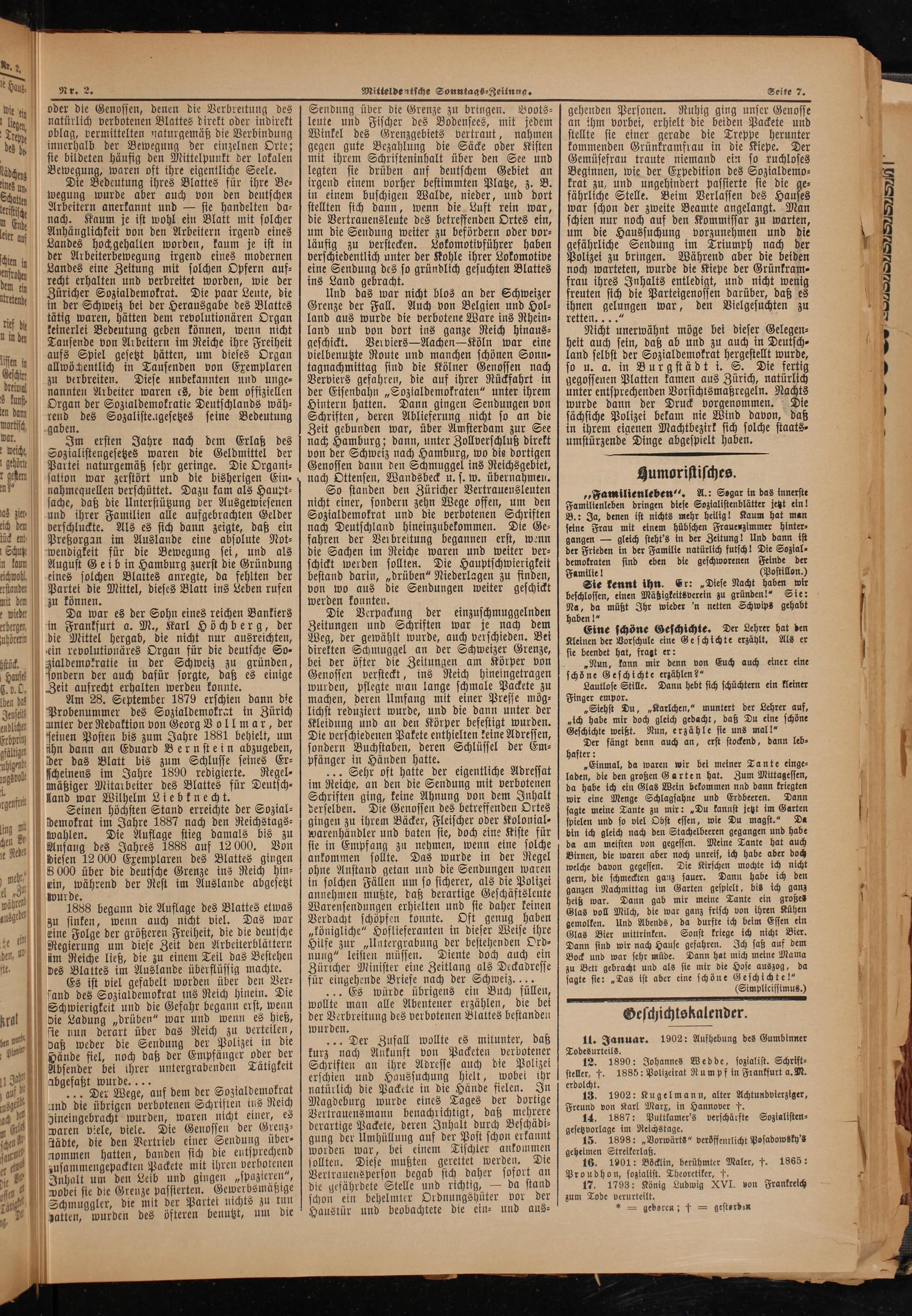 Nicht unerwähnt möge bei dieser Gelegen⸗ heit auch sein, daß ab und zu auch in Deutsch⸗ land selbst der Sozialdemokrat hergestellt wurde, so u. a. in Burgstädt i. S. Die fertig gegossenen Platten kamen aus Zürich, natürlich unter entsprechenden Vorsichtsmaßregeln. Nachts wurde dann der Druck vorgenommen. Die sächsiche Polizei bekam nie Wind davon, daß in ihrem eigenen Machtbezirk sich solche staats⸗ umstürzende Dinge abgespielt haben.