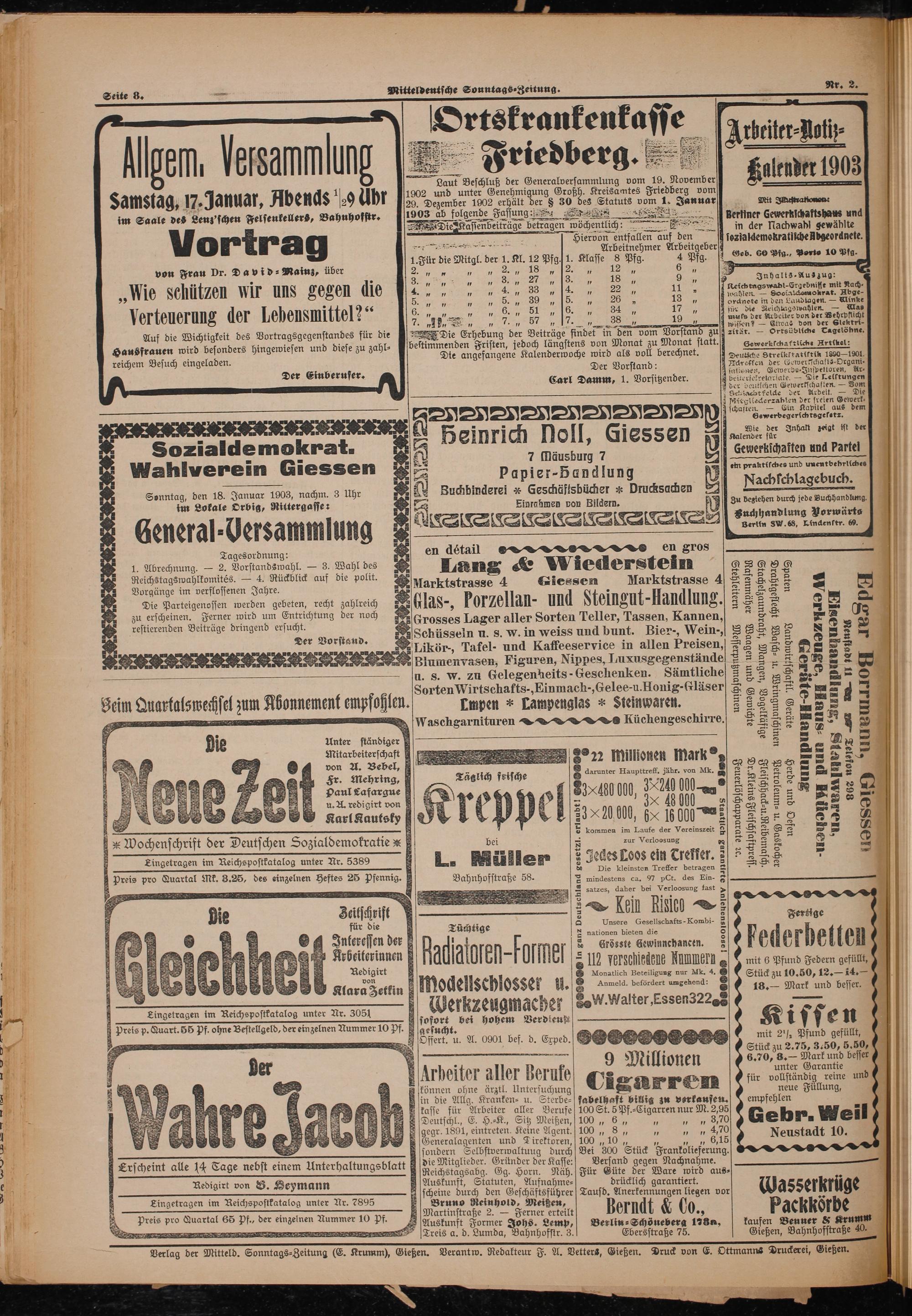 Verlag der Mitteld. Sonntags⸗Zeitung(E. Krumm), Gießen. Verantw. Redakteur F. A. Vetters, Gießen. Druck von E. Ottmanns Druckerei, Gießen.