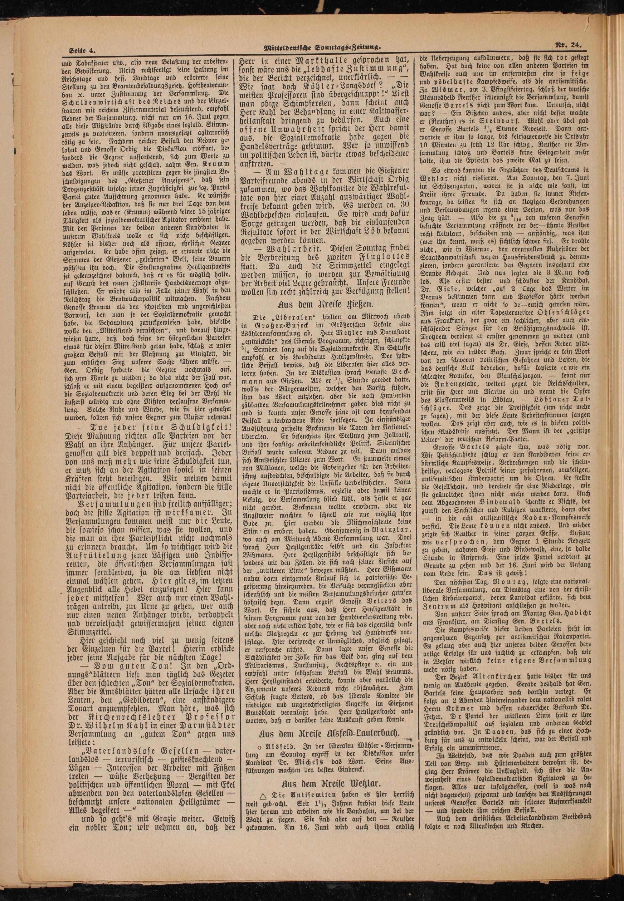 Die Kampfesweise dieser beiden Parteien steht im angenehmen Gegensatz zur antisemitschen Radaupartei. Es gelang aber auch hier unseren beiden Genossen der⸗ artige Erfolge für uns sachlich zu erkämpfen, daß wir in Wetzlar wirklich keine eigene Versammlung mehr nötig haben.