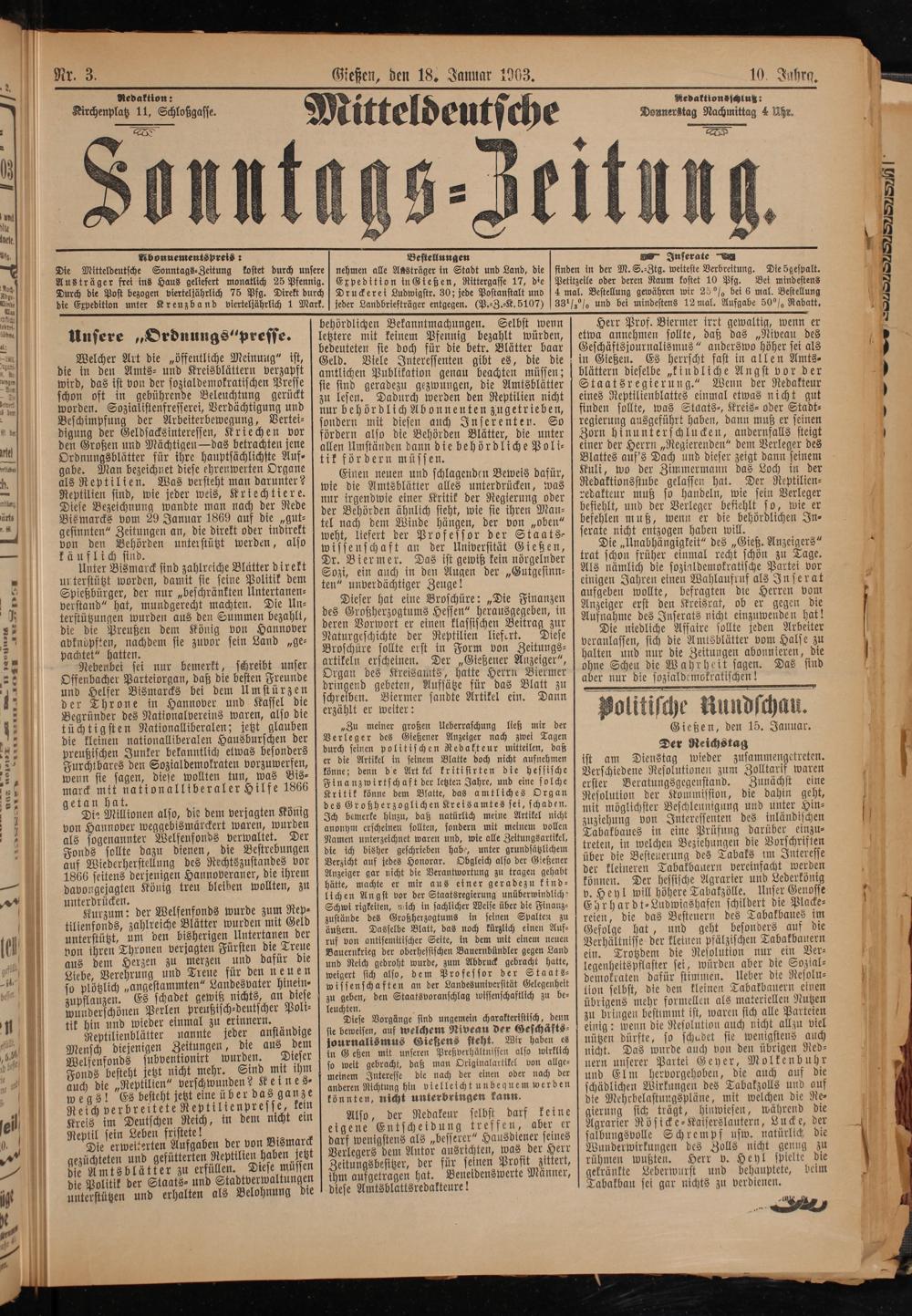 Welcher Art die„öffentliche Meinung“ ist, die in den Amts⸗ und Kreisblättern verzapft wird, das ist von der sozialdemokratischen Presse schon oft in gebührende Beleuchtung gerückt worden. Sozialistenfresserei, Verdächtigung und Beschimpfung der Arbeiterbewegung, Vertei⸗ digung der Geldsacksinteressen, Kriechen vor den Großen und Mächtigen— das betrachten jene Ordnungsblätter für ihre hauptsächlichste Auf⸗ gabe. Man bezeichnet diese ehrenwerten Organe als Reptilien. Was versteht man darunter? Reptilien sind, wie jeder weis, Kriechtiere. Diese Bezeichnung wandte man nach der Rede Bis marcks vom 29 Januar 1869 auf die„gut⸗ gesinnten“ Zeitungen an, die direkt oder indirekt von den Behörden unterstützt werden, also käuflich sind.