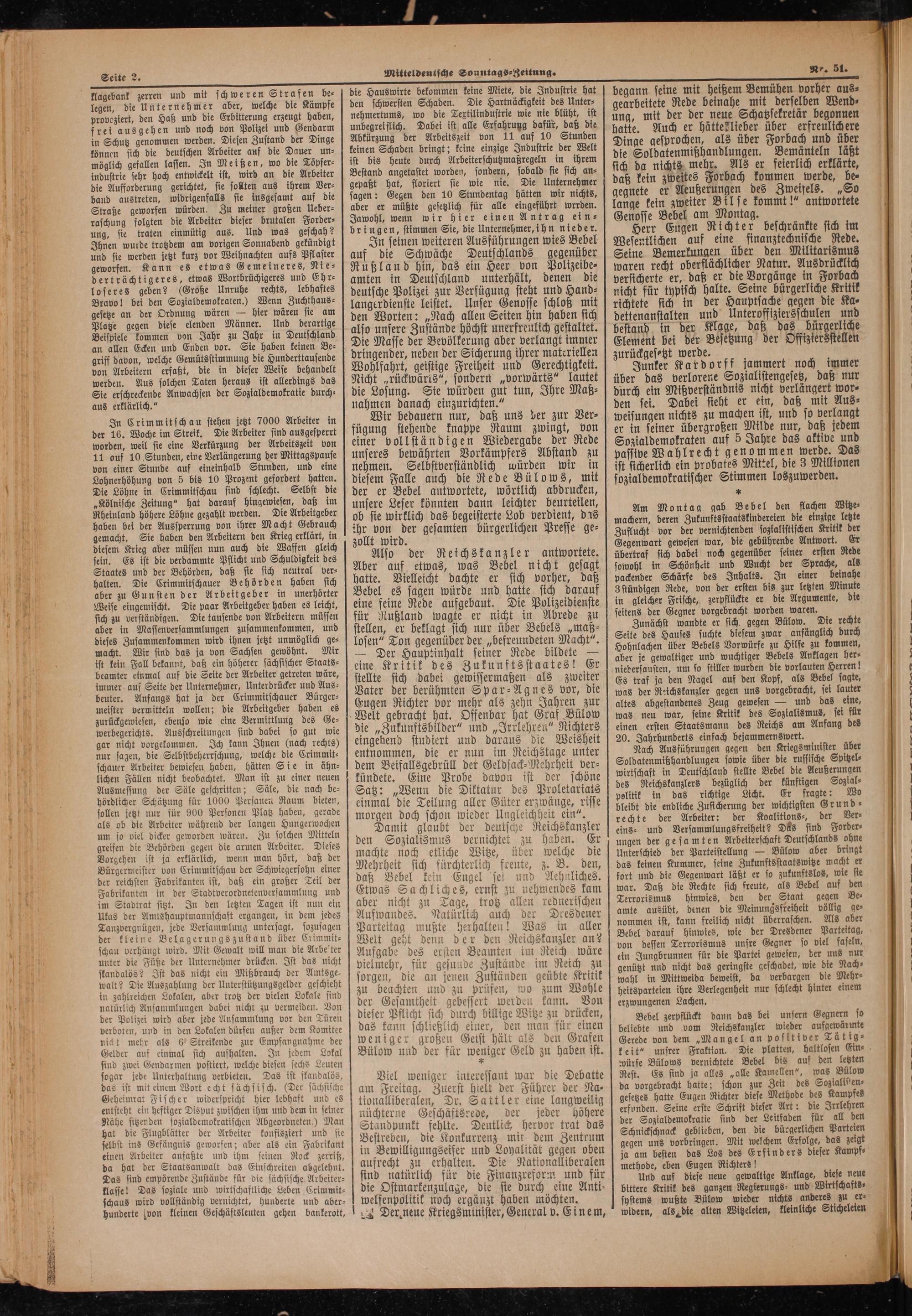 In seinen weiteren Ausführungen wies Bebel auf die Schwäche Deutschlands gegenüber Rußland hin, das ein Heer von Polizeibe⸗ amten in Deutschland unterhält, denen die deutsche Polizei zur Verfügung steht und Hand⸗ langerdienste leistet. Unser Genosse schloß mit den Worten:„Nach allen Seiten hin haben sich also unsere Zustände höchst unerfreulich gestaltet. Die Masse der Bevölkerung aber verlangt immer dringender, neben der Sicherung ihrer materiellen Wohlfahrt, geistige Freiheit und Gerechtigkeit. Nicht„rückwärts“, sondern„vorwärts“ lautet die Losung. Sie würden gut tun, Ihre Maß⸗ nahmen danach einzurichten.“