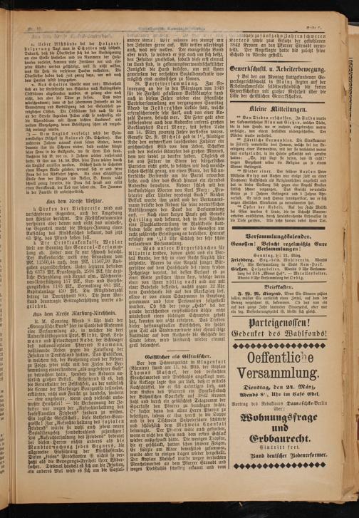 Sonntag, d. 21. März. Friedberg. Soz.⸗dem. Wahl verein. Abends 8½ Uhr Versammlung in Stadt New⸗York. Gießen. Holzarbeiter. Abends 9 Uhr Versamm⸗ lung bei Löb„Wiener Hof“.— Metallarbeiter.