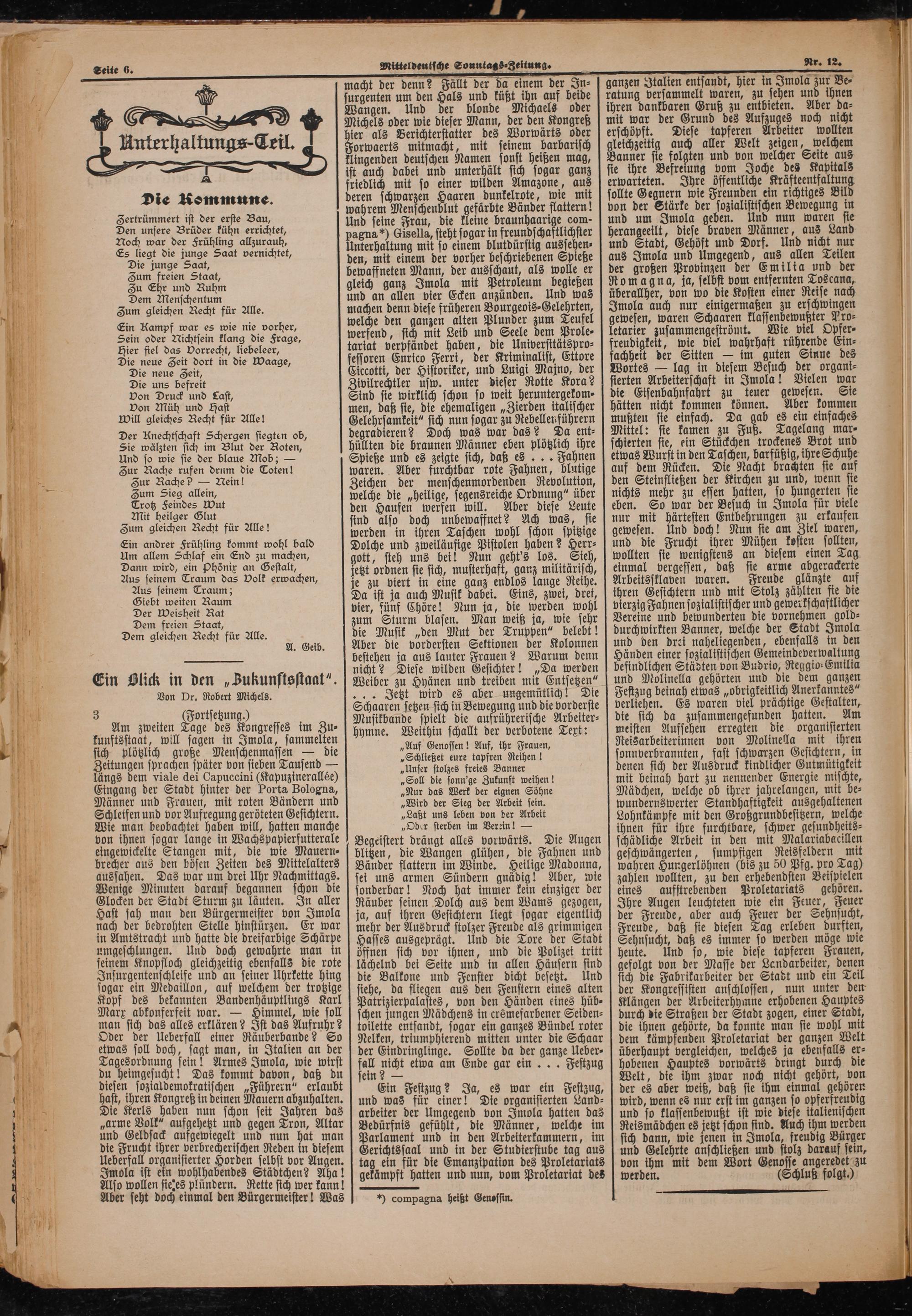 macht der denn? Fällt der da einem der In⸗ surgenten um den Hals und küßt ihn auf beide Wangen. Und der blonde Michaels oder Michels oder wie dieser Mann, der den Kongreß ier als Berichterstatter des Worwärts oder orwaerts mitmacht, mit seinem barbarisch klingenden deutschen Namen sonst heißen mag, ist auch dabei und unterhält sich sogar ganz friedlich mit so einer wilden Amazone, aus deren schwarzen Haaren dunkelrote, wie mit wahrem Menschenblut gefärbte Bänder flattern! Und seine Frau, die kleine braunhaarige com- pagna) Gisella, steht sogar in freunds caftlichser Unterhaltung mit so einem blutdürstig aussehen⸗ den, mit einem der vorher beschriebenen Spieße bewaffneten Mann, der ausschaut, als wolle er gleich ganz Imola mit Petroleum begießen und an allen vier Ecken anzünden. Und was machen denn diese früheren Bourgeois⸗Gelehrten, welche den ganzen alten Plunder zum Teufel werfend, sich mit Leib und Seele dem Prole⸗ tariat verpfändet haben, die Universttätspro⸗ fessoren Enrico Ferri, der Kriminalist, Ettore Ciccotti, der Historiker, und Luigi Majno, der Zivilrechtler usw. unter dieser Rotte Kora? Sind sie wirklich schon so weit heruntergekom⸗ men, daß sie, die ehemaligen„Zierden italischer Gelehrsamkeit“ sich nun sogar zu Rebellen führern degradieren? Doch was war das? Da ent⸗ hüllten die braunen Männer eben plötzlich ihre Spieße und es zeigte sich, daß es... Fahnen waren. Aber furchtbar rote Fahnen, blutige Zeichen der menschenmordenden Revolution, welche die„heilige, segensreiche Ordnung“ über den Haufen werfen will. Aber diese Leute sind also doch unbewaffnet? Ach was, sie werden in ihren Taschen wohl schon spitzige Dolche und zweiläufige Pistolen haben? Herr⸗ gott, steh uns bei! Nun geht's los. Sieh, jetzt ordnen ste sich, musterhaft, ganz militärisch, je zu viert in eine ganz endlos lange Reihe. Da ist ja auch Musik dabei. Eins, zwei, dret, vier, fünf Chöre! Nun ja, die werden wohl zum Sturm blasen. Man weiß ja, wie sehr die Musik„den Mut der Truppen“ belebt! Aber die vordersten Sektionen der Kolonnen bestehen ja aus lauter Frauen? Warum denn nicht? Diese wilden Gesichter!„Da werden Weiber zu Hyänen und treiben mit Entsetzen“ ... Jetzt wird es aber ungemütlich! Die Schaaren setzen sich in Bewegung und die vorderste Musikbande spielt die aufrührerische Arbeiter⸗ hymne. Weithin schallt der verbotene Text: