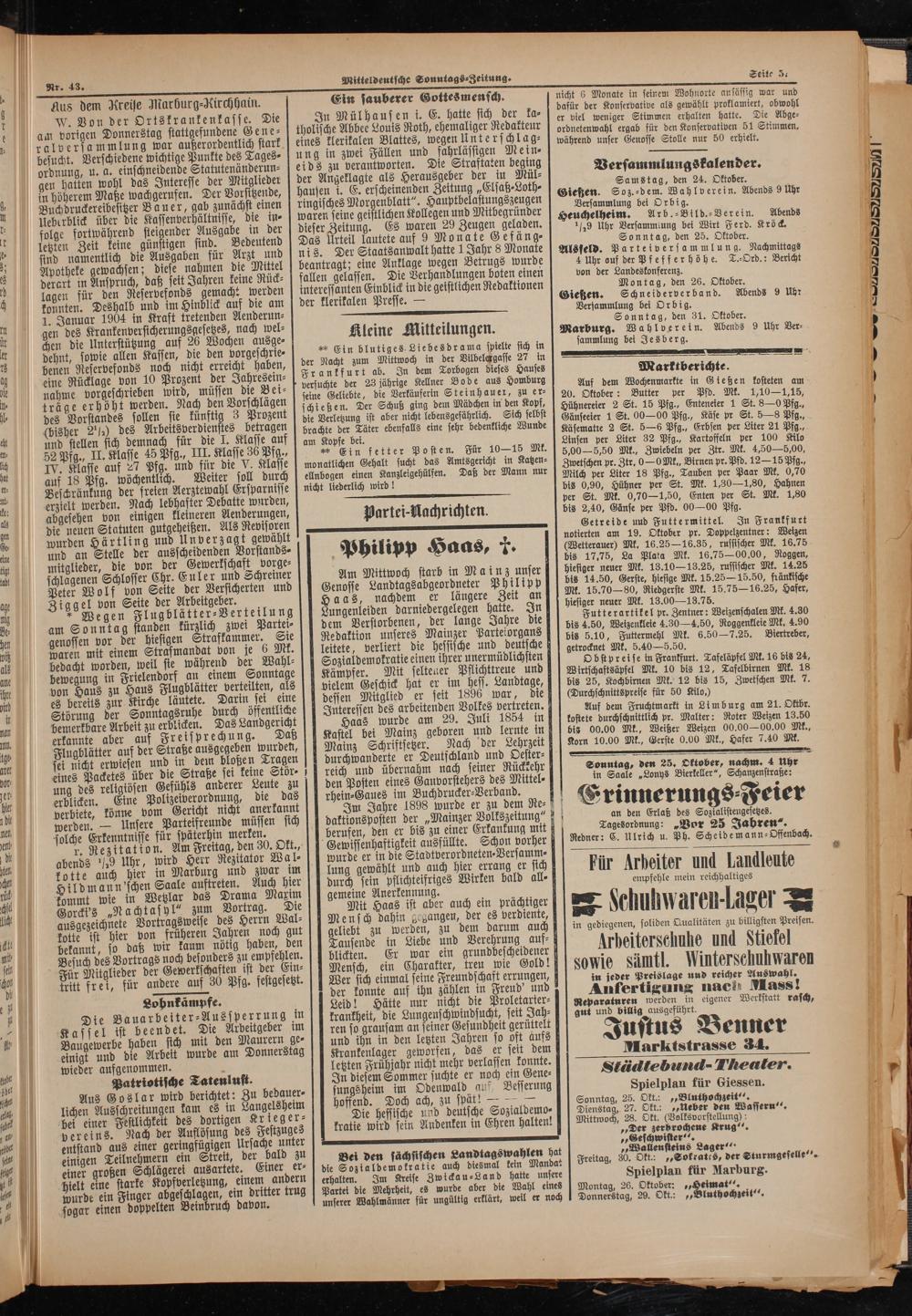 Am Mittwoch starb in Mainz unser Genosse Landtagsabgeordneter Philipp Haas, nachdem er längere Zeit an Lungenleiden darniedergelegen hatte. In dem Verstorbenen, der lange Jahre die Redaktion unseres Mainzer Parteiorgans leitete, verliert die hessische und deutsche Sozialdemokratie einen ihrer unermüdlichsten Kämpfer. Mit selteuer Pflichttreue und vielem Geschick hat er im hess. Landtage, dessen Mitglied er seit 1896 war, die Interessen des arbeitenden Volkes vertreten.