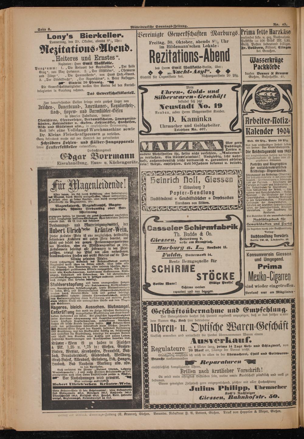 Dertag er Diltteid. Sonmtags-Zeitung(E. Krumm), Gießen. Verantw. Redakteur F. A. Vetters, Gießen. Druck von Heppeler& Meyer, Gießen.