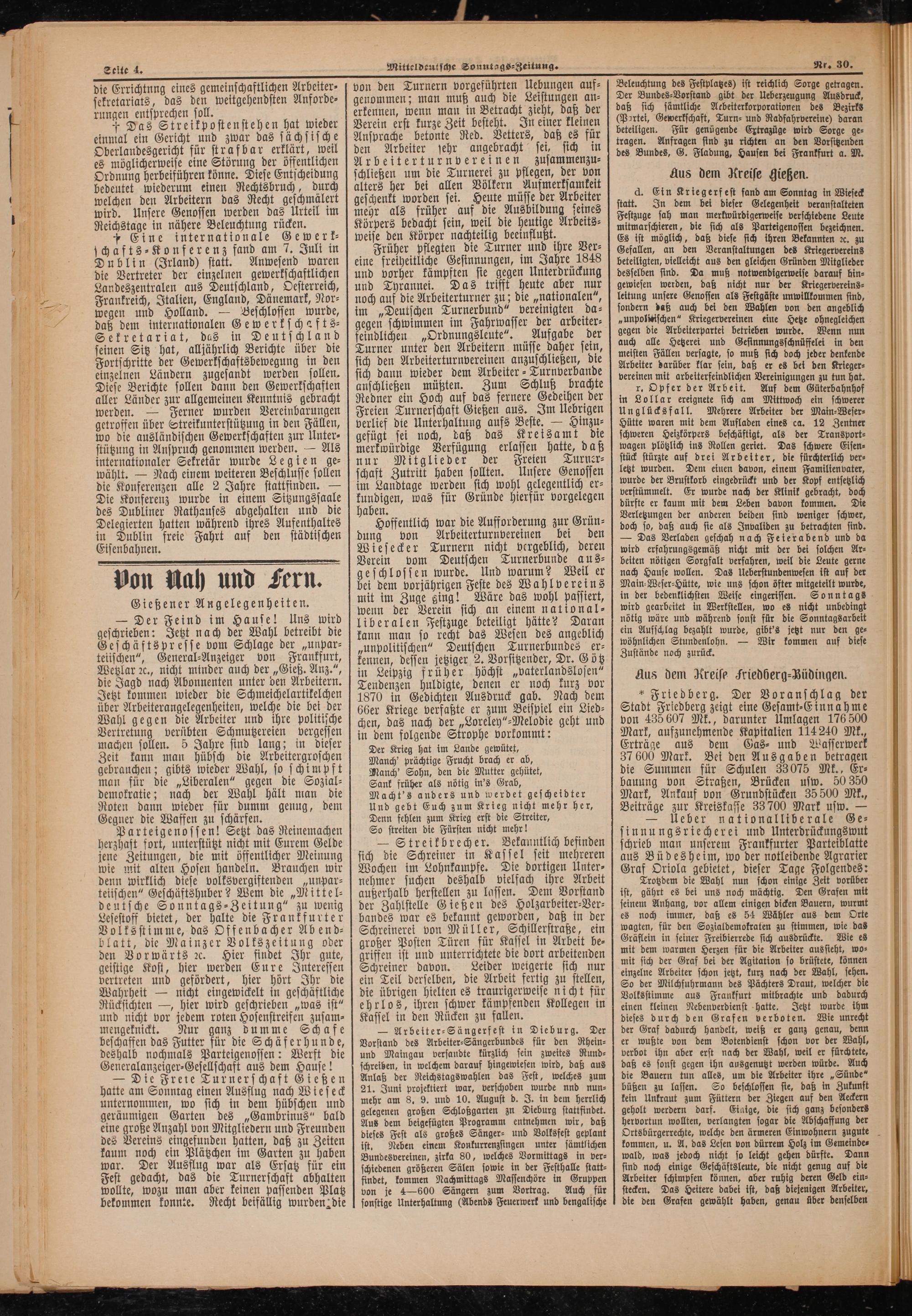 — Die Frete Turnerschaft Gießen hatte am Sonntag einen Ausflug nach Wieseck unternommen, wo sich in dem hübschen und geräumigen Garten des„Gambrinus“ bald eine große Anzahl von Mitgliedern und Freunden des Vereins eingefunden hatten, daß zu Zeiten kaum noch ein Plätzchen im Garten zu haben war. Der Ausflug war als Ersatz für ein