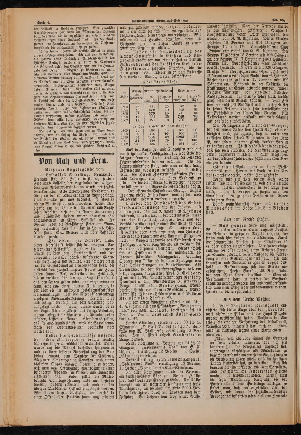 — Lassalles Todestag. Kommenden Montag sind 39 Jahre verflossen, seitdem Ferdinand Lassalle, der Begründer des Allgem. deutschen Arbeitervereins und damit der sozial⸗ demokratischen Arbeiterbewegung überhaupt, zu Genf an der im Duell erhaltenen Wunde starb. Was Lassalle für uns bedeutet, ist schon in diesem Blatte oft dargelegt worden. Seine Ver⸗ dienste um die Sache der Arbeiter und Besitz⸗ losen behalten diese in dankbarer Erinnerung und alljährlich halten unsere Genossen Ge⸗ dächtuisfeiern zu Ehren Lassalles ab. In Gießen findet die diesjährige Feier am Sonn⸗ tag nachmittag von 3½ Uhr in Loay's Bier⸗ keller statt. Gen. Vetters wird über Lassalles Wirken sprechen.
