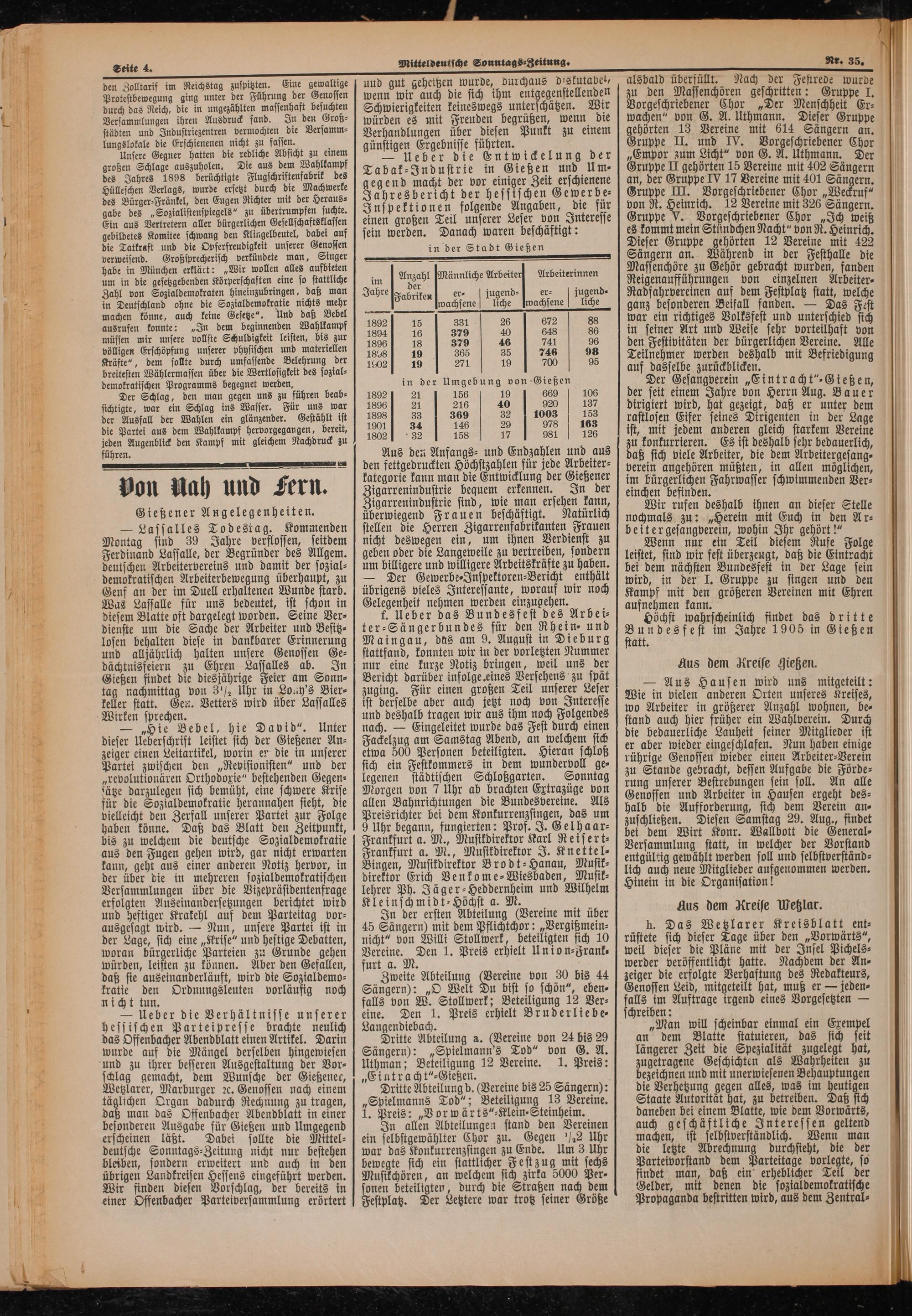 Der Gesangverein„Eintracht“ ⸗Gießen, der seit einem Jahre von Herrn Aug. Bauer dirigiert wird, hat gezeigt, daß er unter dem rastlosen Eifer seines Dirigenten in der Lage ist, mit jedem anderen gleich starkem Vereine zu konkurrieren. Es ist deshalb sehr bedauerlich, daß sich viele Arbeiter, die dem Arbeitergesang⸗ verein angehören müßten, in allen möglichen, im bürgerlichen Fahrwasser schwimmenden Ver⸗ einchen befinden.